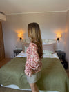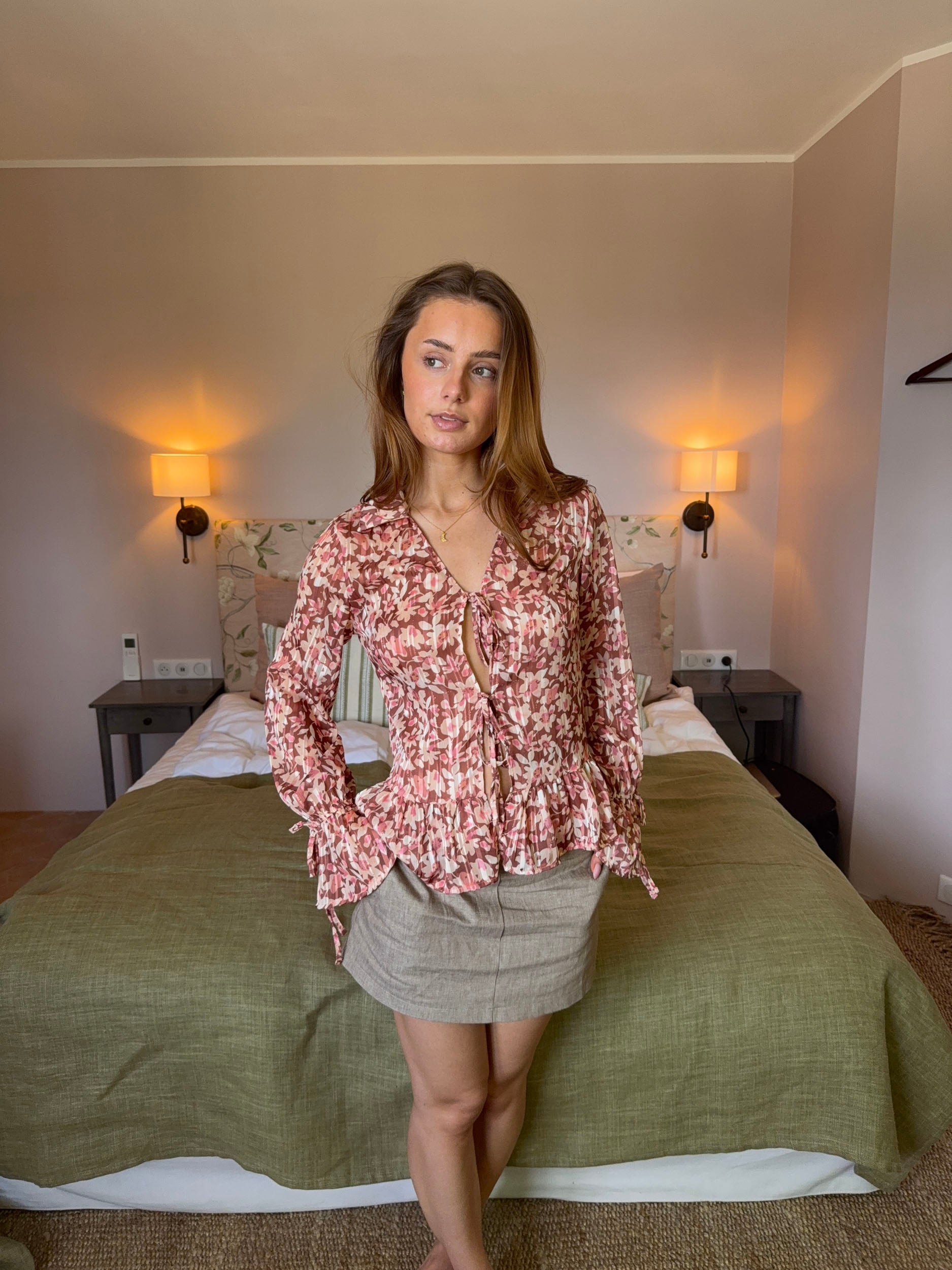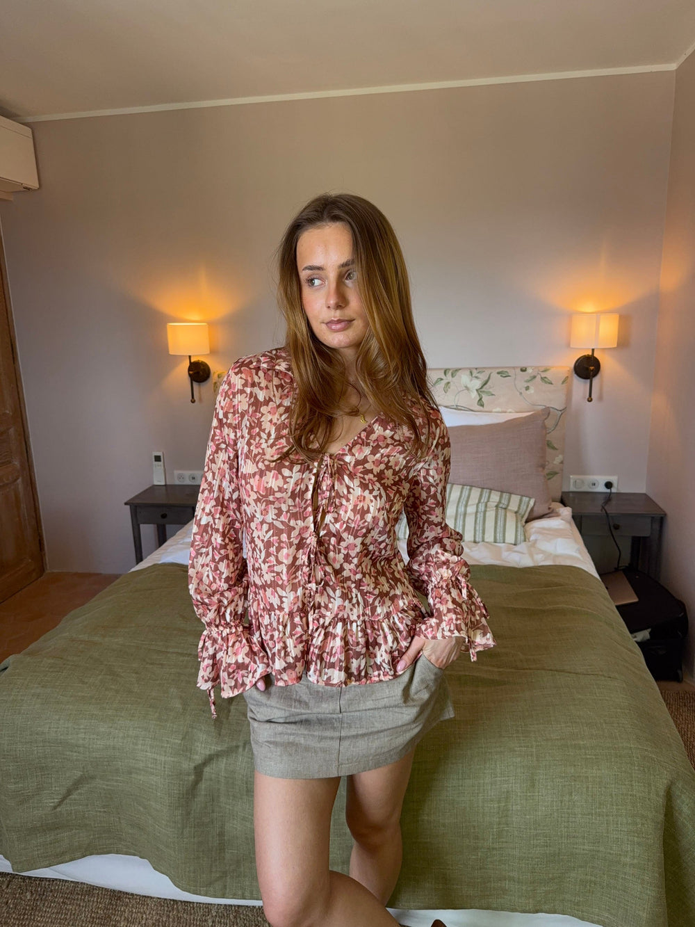 This long-sleeved blouse with a pink floral print combines feminine charm with a modern edge. Featuring ruched detailing, a peplum effect, and wide cuffs with tie closures, it’s both elegant and eye-catching.