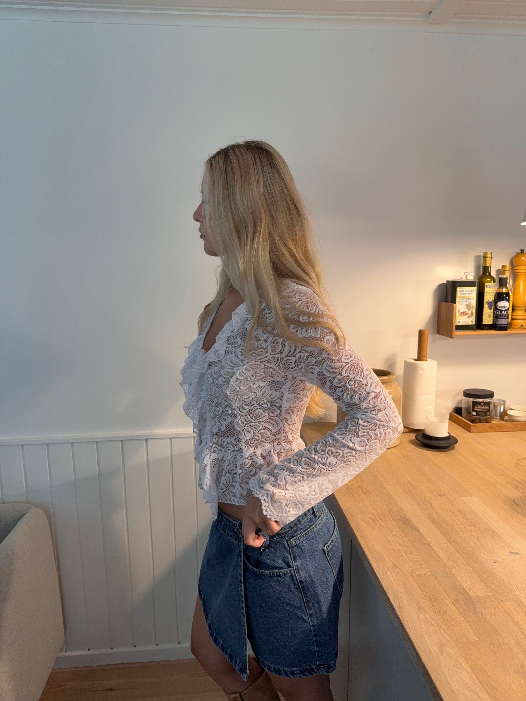 This white lace blouse is a feminine piece with elegant detailing. The sheer lace pattern is combined with a flattering front tie closure and gentle waist shaping, creating a beautiful silhouette.