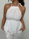 Our Cleo top is made from a linen material that is perfect for the warmer seasons. The top has the finest open back and must be tied at the neck.