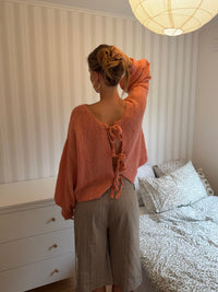 This grey, loose-knit sweater is both relaxed and feminine with its unique tie detail on the back. Three cords form knots, creating a sweet and open look that adds an extra touch of elegance. The soft knit provides a comfortable fit, while the design makes it perfect for the season. An ideal choice for both everyday wear and more casual, cozy moments.