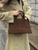 This small suede bag is both stylish and functional, perfect for a trip to the city or a casual stroll around town. It features a long, adjustable strap, allowing you to wear it comfortably as a crossbody. The beautiful gold detail on the closure adds an elegant touch, while the small zippered interior pocket provides practical storage for your essentials. A modern and sophisticated bag that adds a luxurious accent to your outfit.