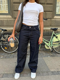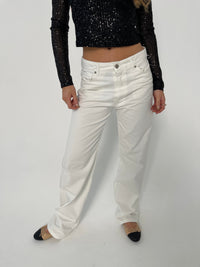 These jeans have a loose and baggy fit. They have a straight fit and a low waist. The trousers have the coolest detail on one back pocket.