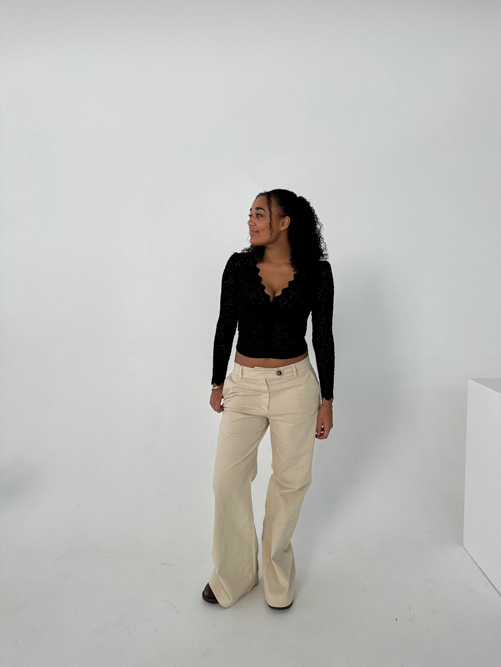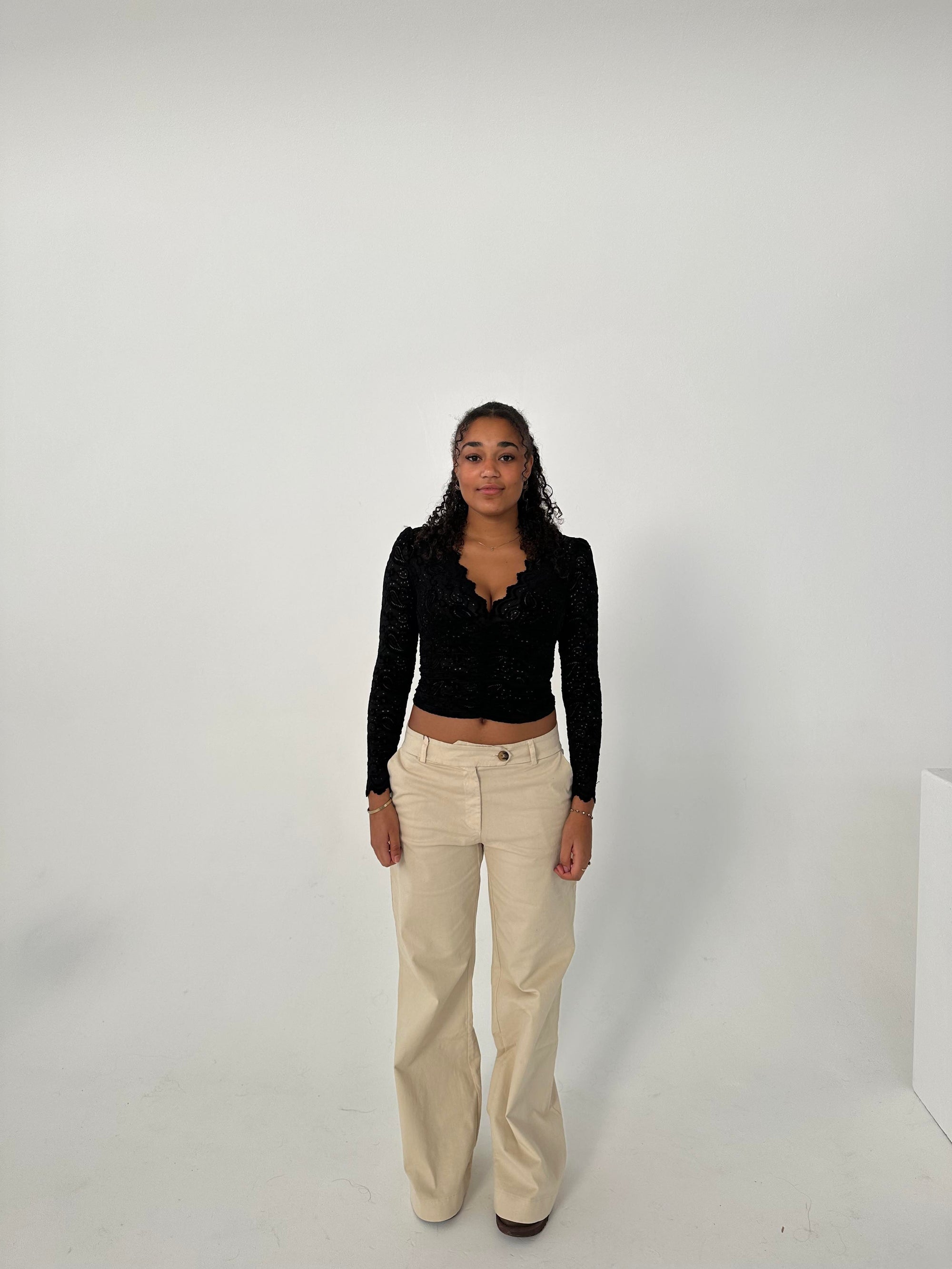 These pants have a loose and casual look and are designed with wide legs. The trousers close with a button and zip at the front. They consist of belt loops, 2 pockets on the sides and have 2 decorative pockets at the back.