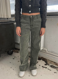 These pants are made in a loose and relaxed look. The pants have a straight leg and 2 side pockets. They consist of belt loops and close with a button and zipper