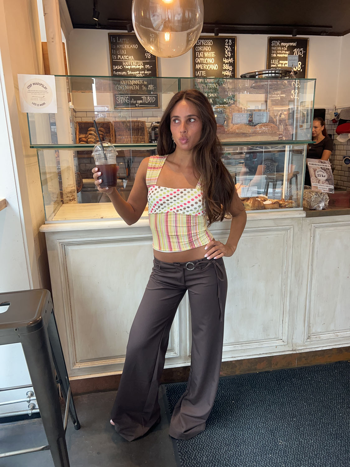 These trendy low-rise trousers combine a cool, laid-back look with elegant details. The wide-leg fit creates a modern and flattering drape, while the adjustable tie belt with a striking silver metal ring adds a unique touch. Made from a soft and textured fabric, the trousers are both comfortable and stylish.