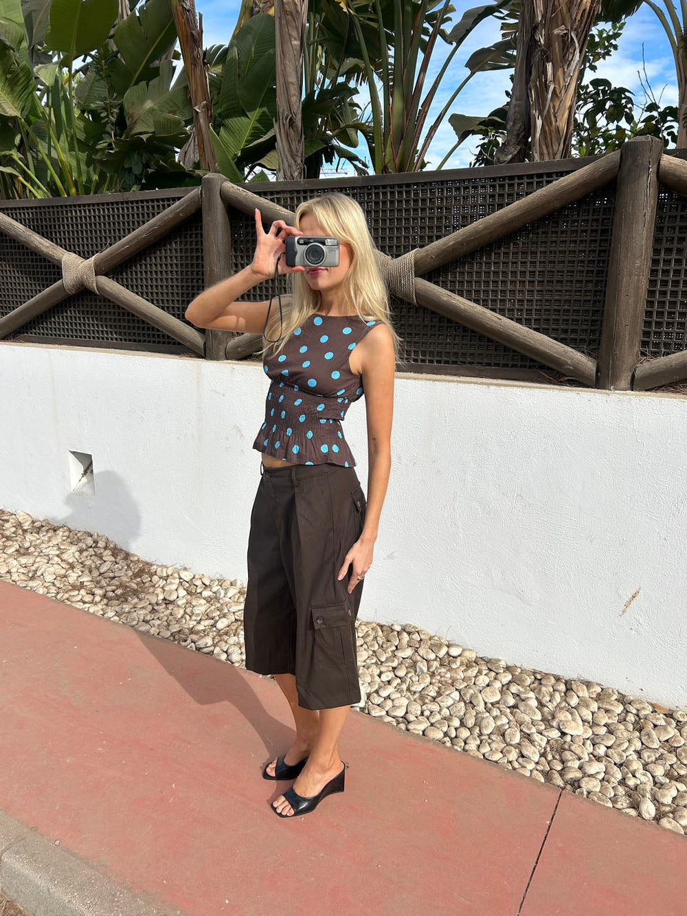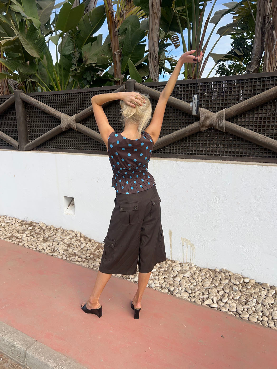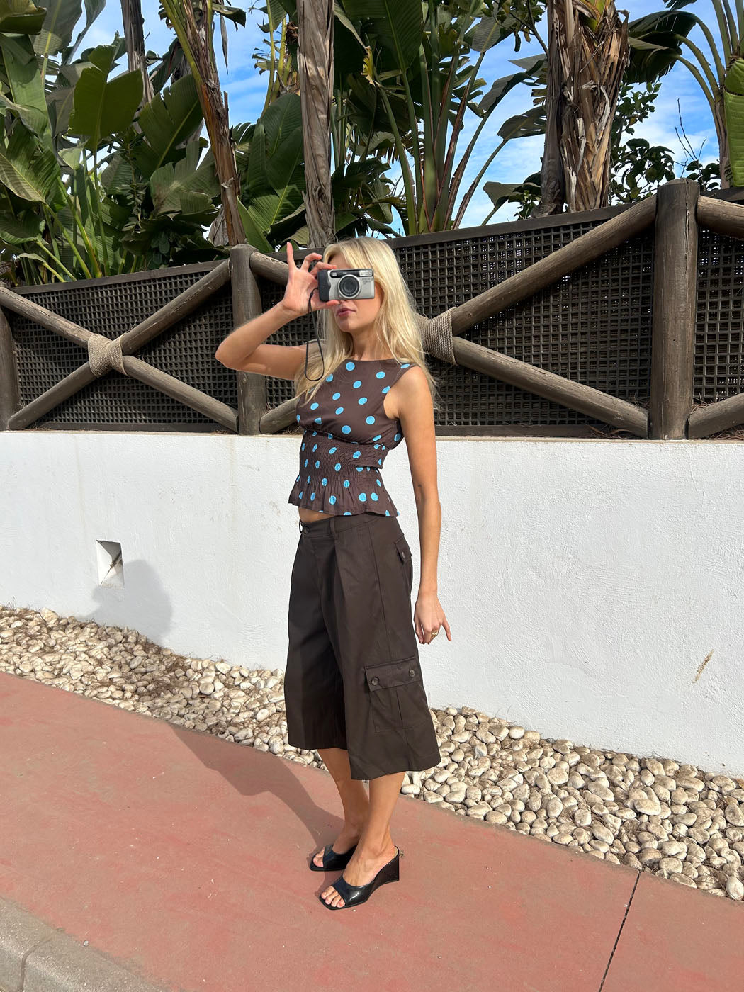 The Cathrine smock top in brown with blue polka dots has a feminine and light look. The top is designed with smock details that provide a close-fitting and flexible fit over the bust, while the lightweight fabric drapes softly around the body. The classic polka dots add a timeless touch, making the top suitable for both casual days and slightly dressier occasions. With its simple cut and comfortable material, it’s easy to style with both jeans, skirts, or shorts.