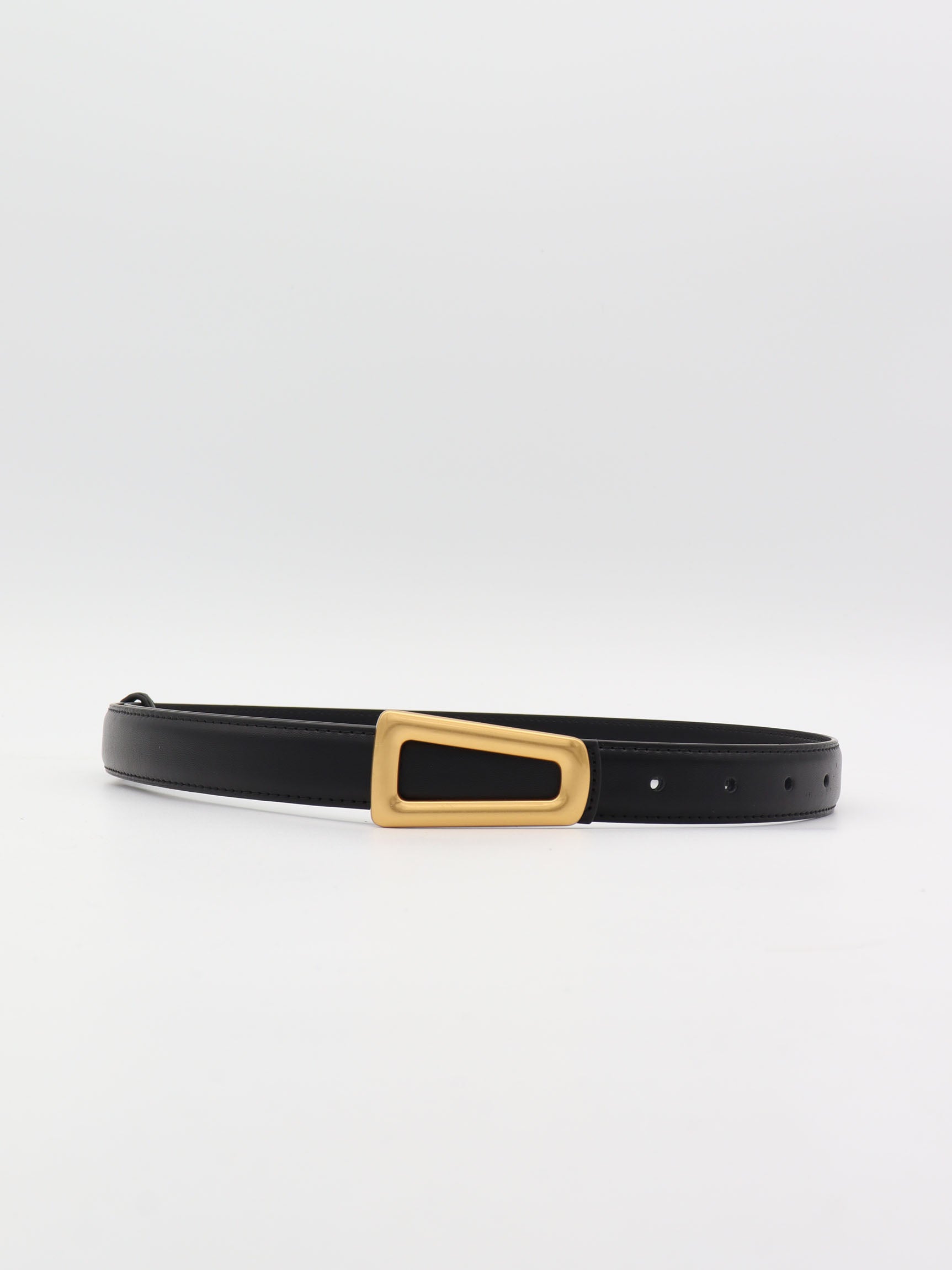 Add a sophisticated finish to your outfit with our “Luce Belt” in black with gold details. The slim design in smooth faux leather is paired with an elegant rectangular buckle in brushed gold, creating a timeless and refined look.