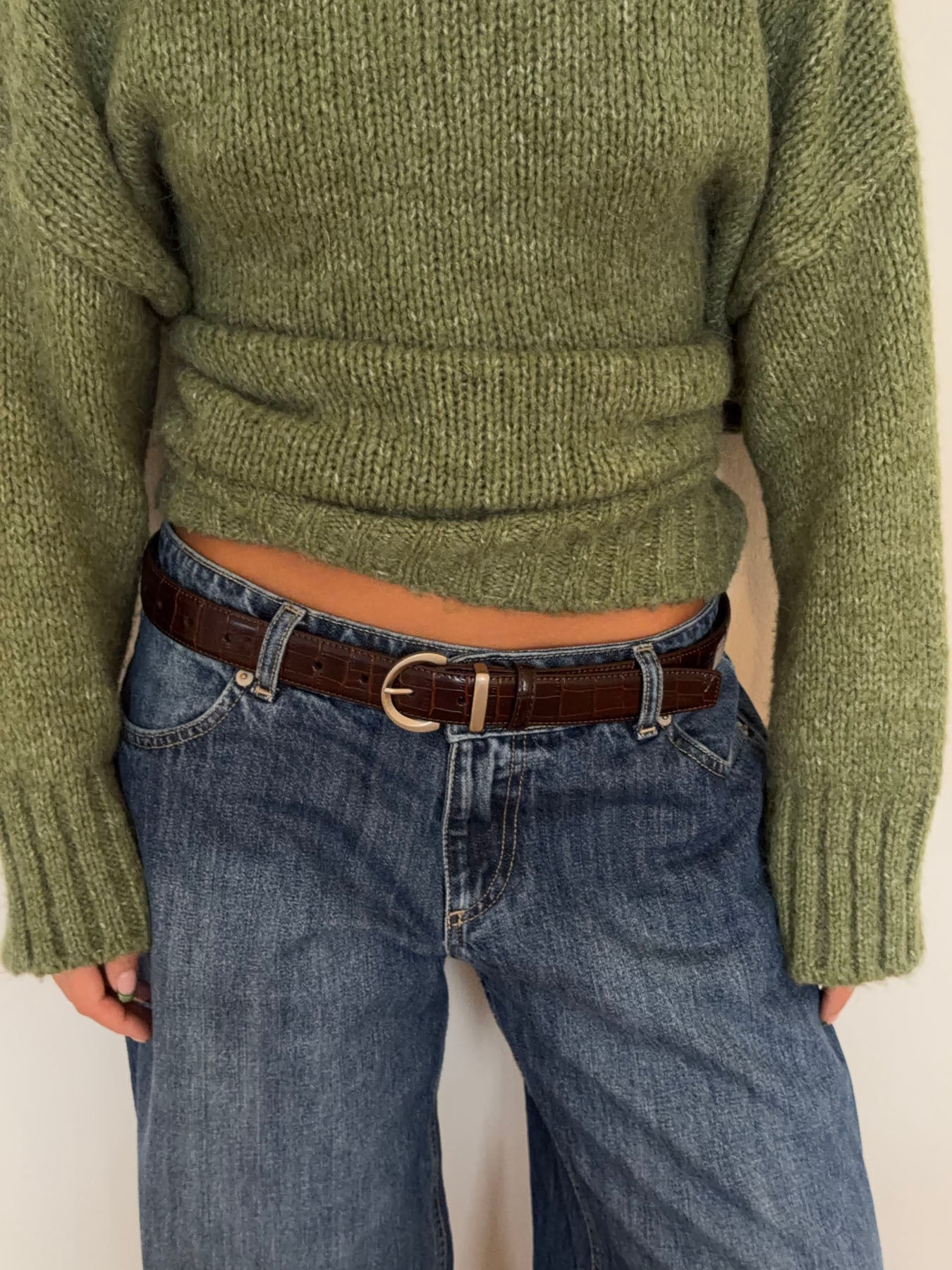 Elevate your wardrobe with this elegant brown crocodile-pattern belt that blends timeless design with modern details. The belt is made from a soft and luxurious leather-look material, offering a beautiful matte texture and refined finish. The round silver buckle creates a striking contrast to the warm brown tone and adds a feminine, stylish touch.