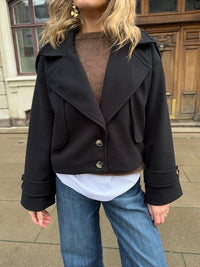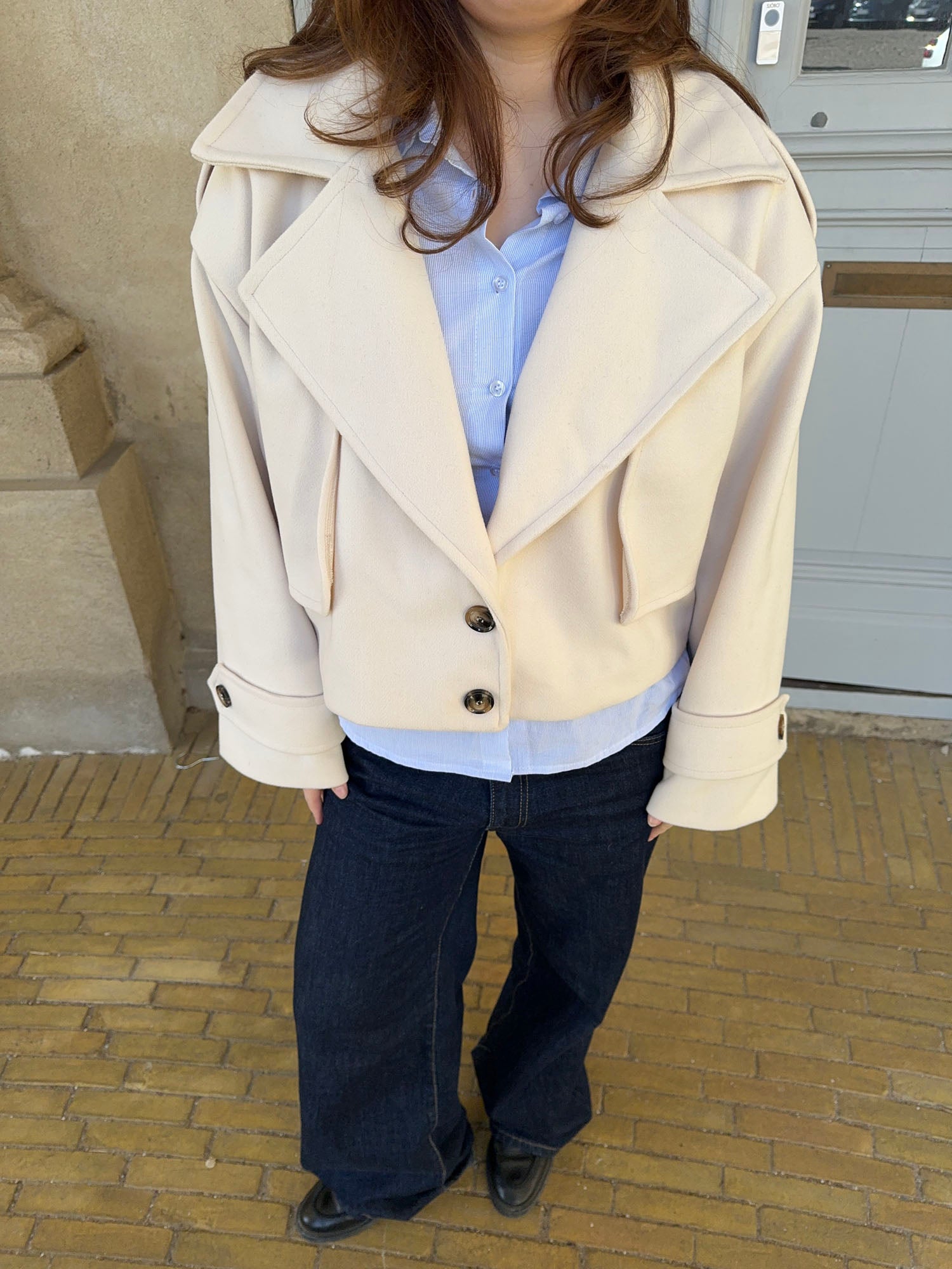 This short white coat exudes classic elegance with its timeless design. It features a lapel collar for a sophisticated and stylish look, along with sleeve straps with a button detail for a subtle touch. The coat fastens with two buttons, creating a sharp and modern appearance. Its short length makes it both practical and versatile, perfect for pairing with both casual and more formal outfits. A classic choice that never goes out of style.