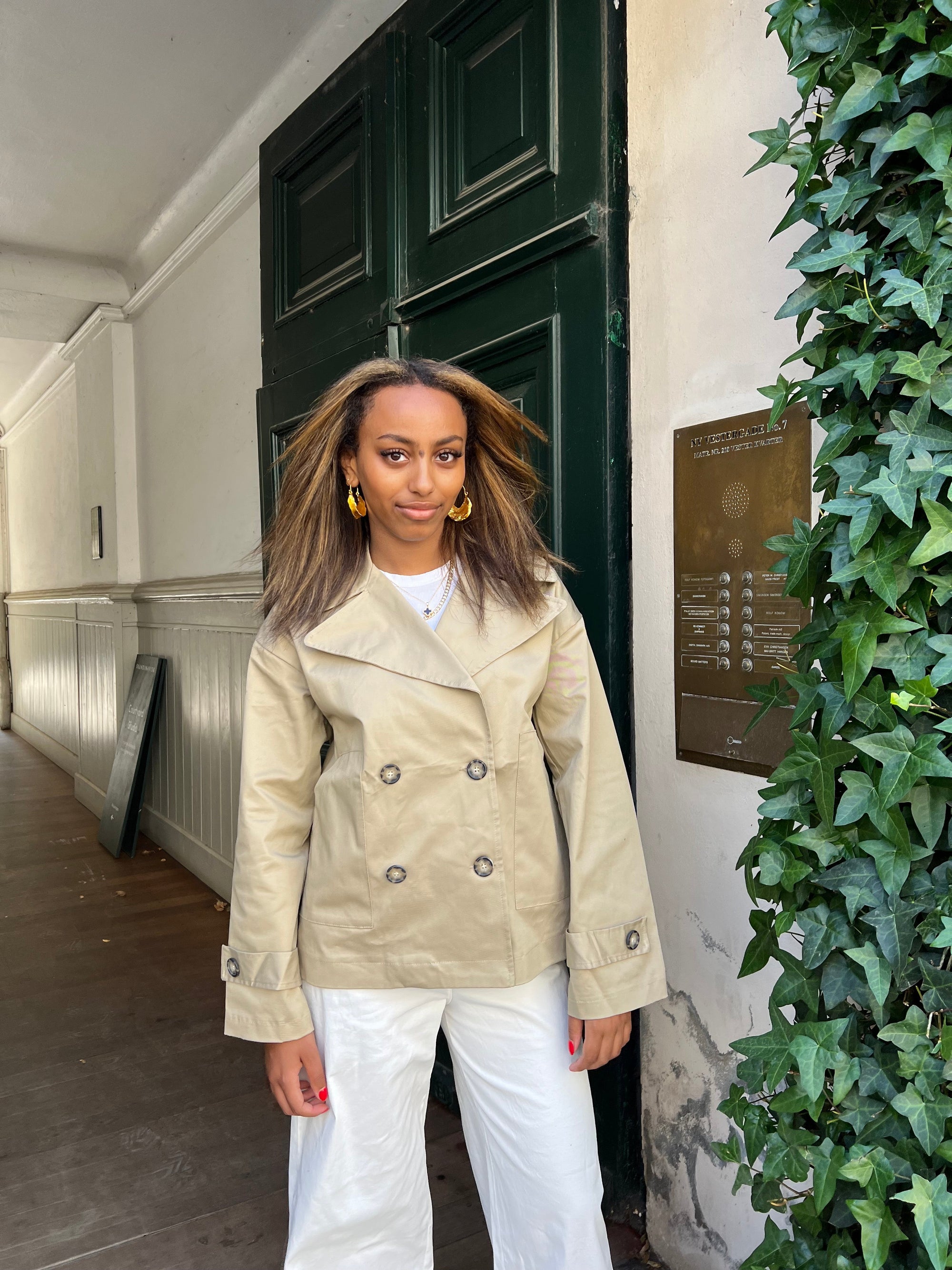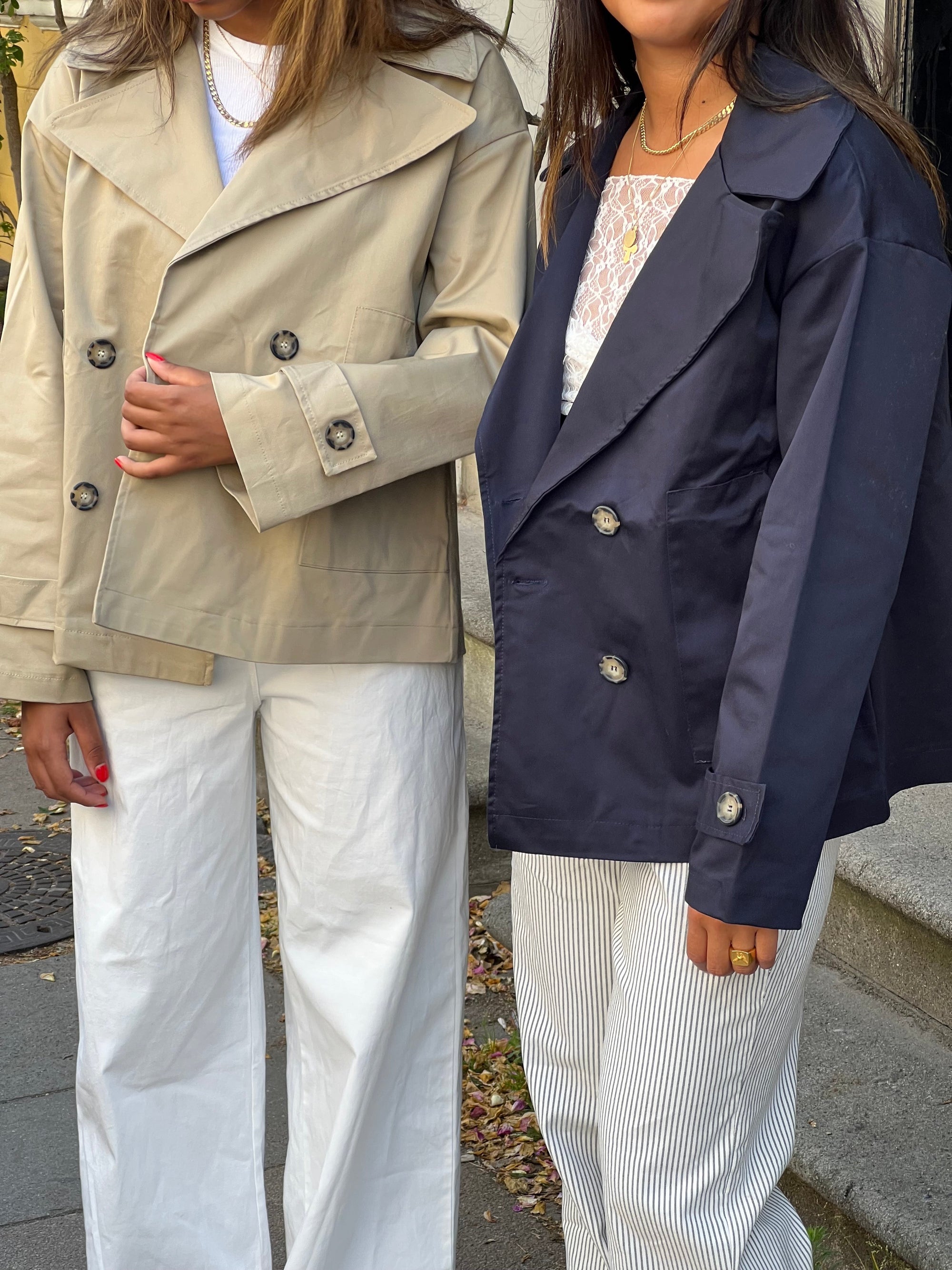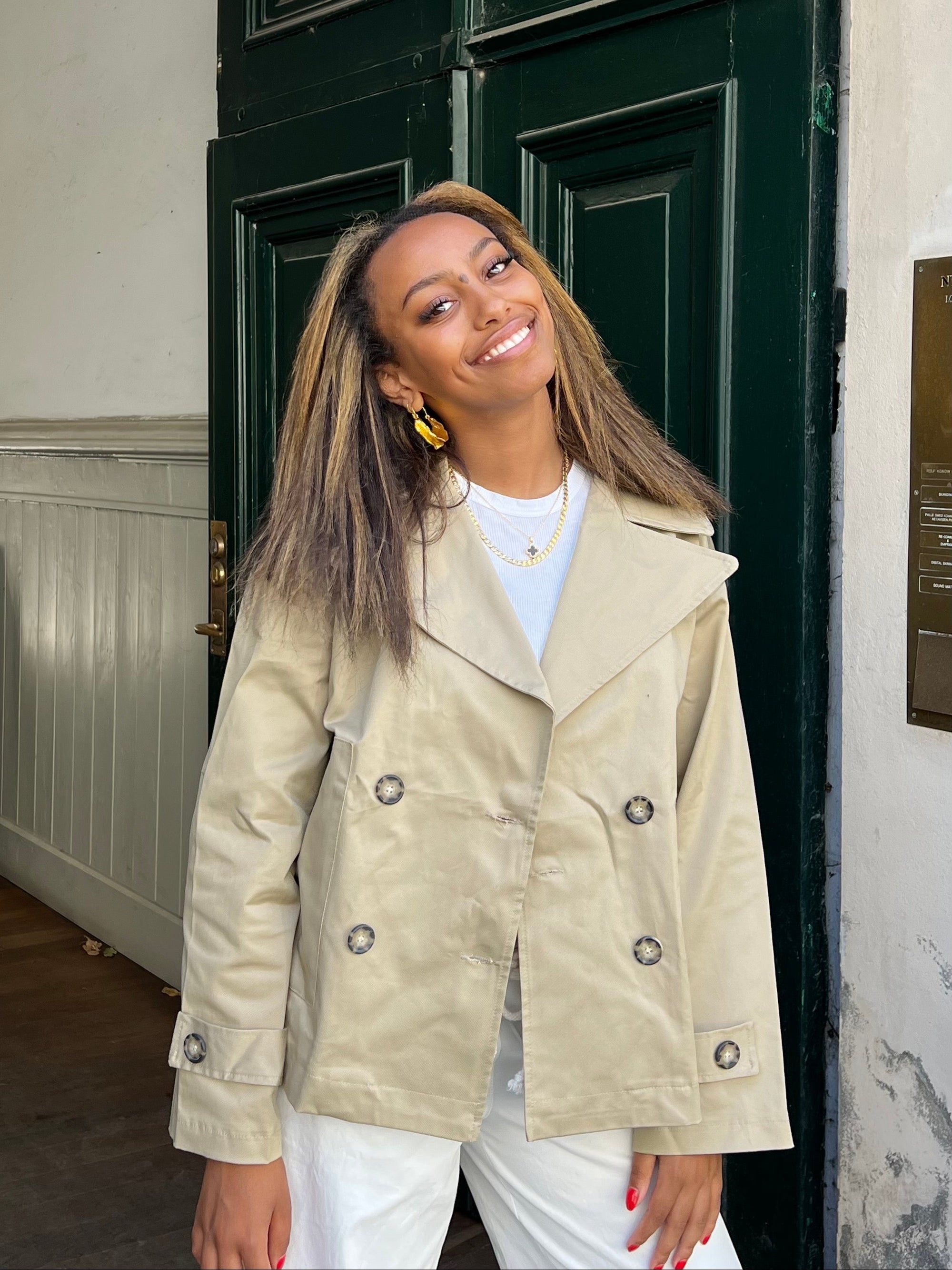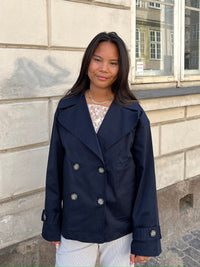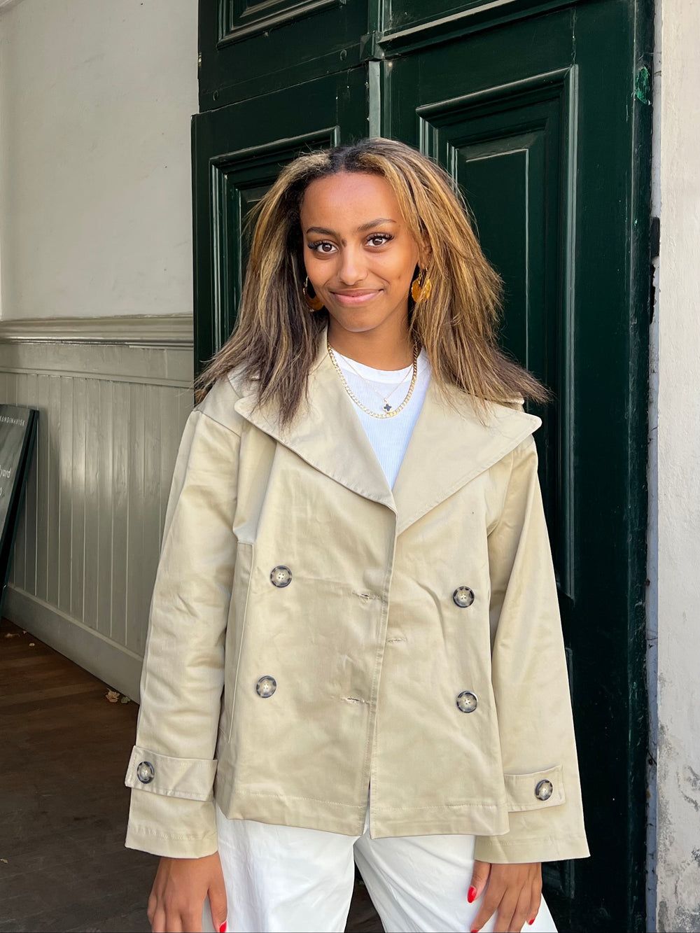 This jacket has a loose fit. The jacket has wide lapels and 2 large side pockets. It has a button closure at the front and has the finest sleeves with a strap and button detail at the end.