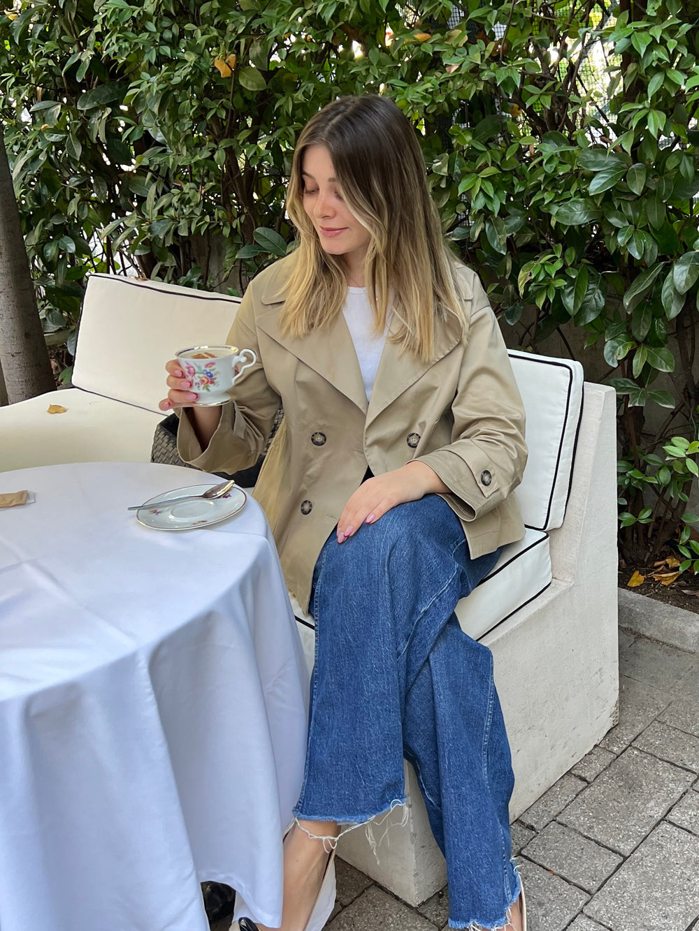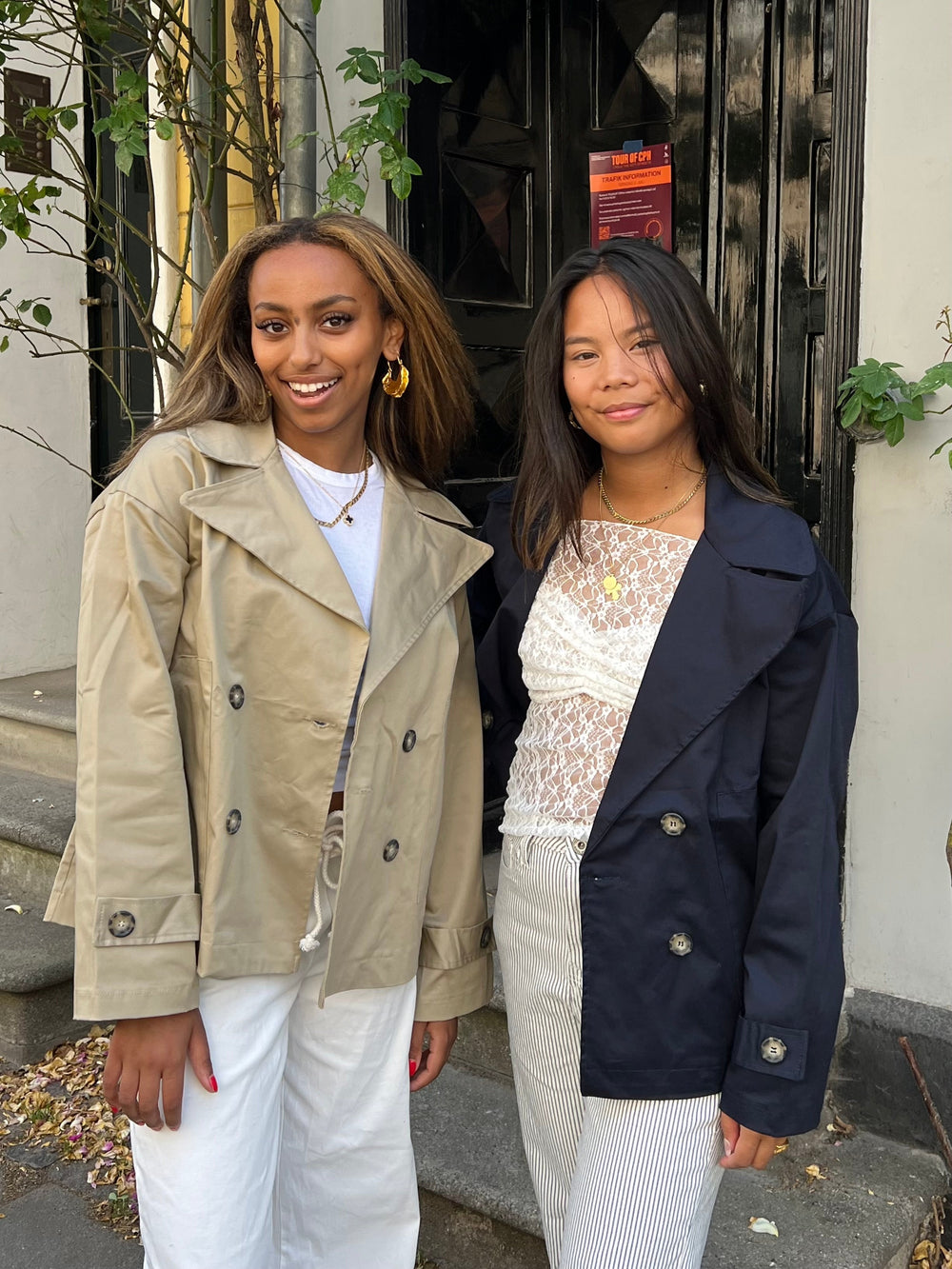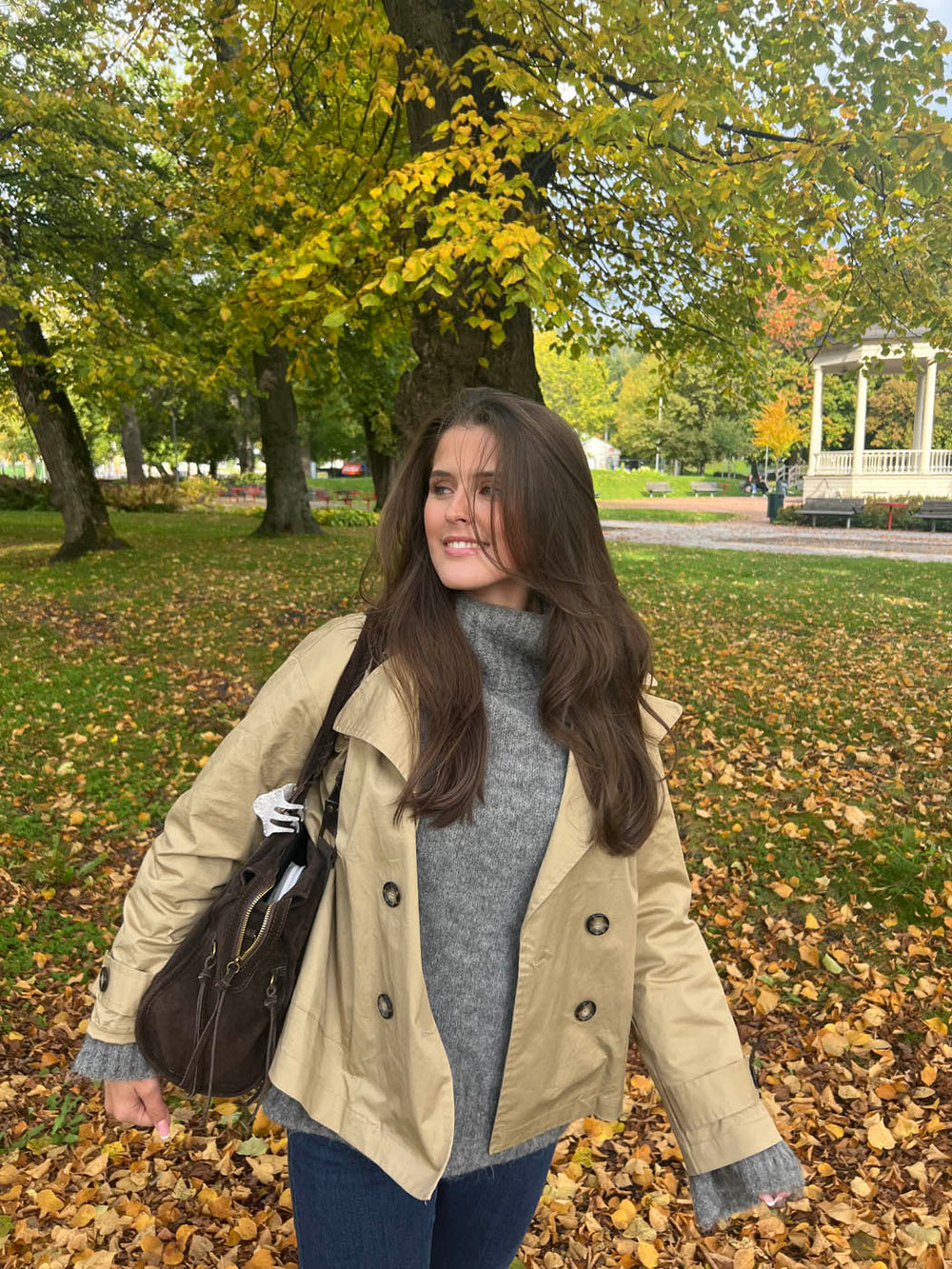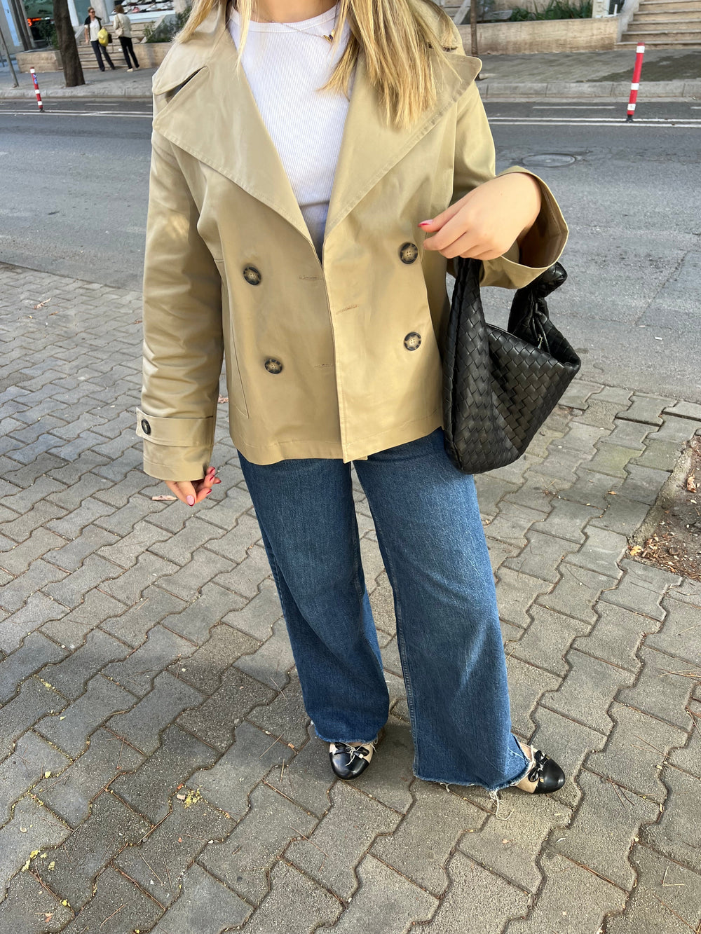 This jacket has a loose fit. The jacket has wide lapels and 2 large side pockets. It has a button closure at the front and has the finest sleeves with a strap and button detail at the end.
