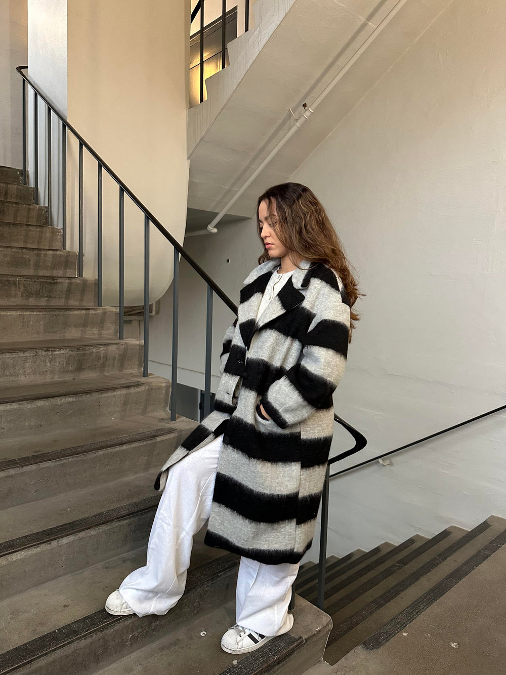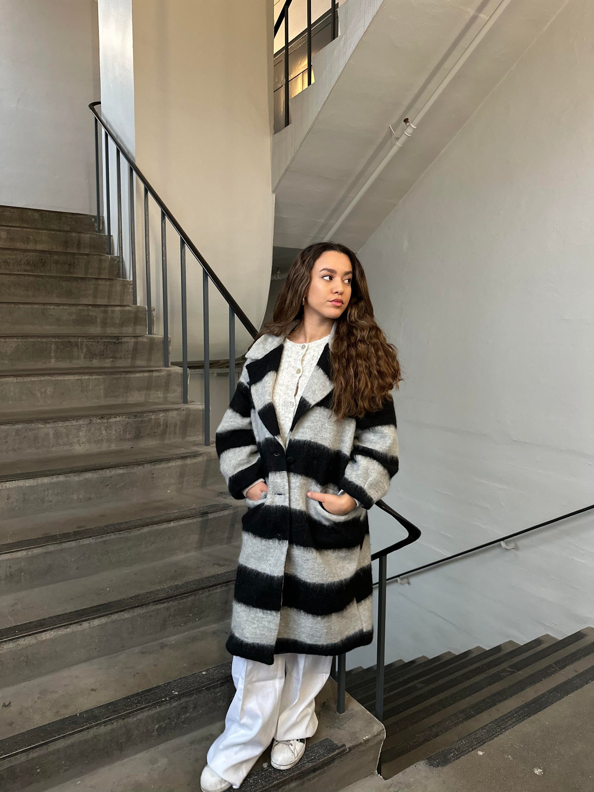 Oversized coat with horizontal black stripes. The coat closes with buttons along the front and has two pockets. It has wide lapels and a long fit.