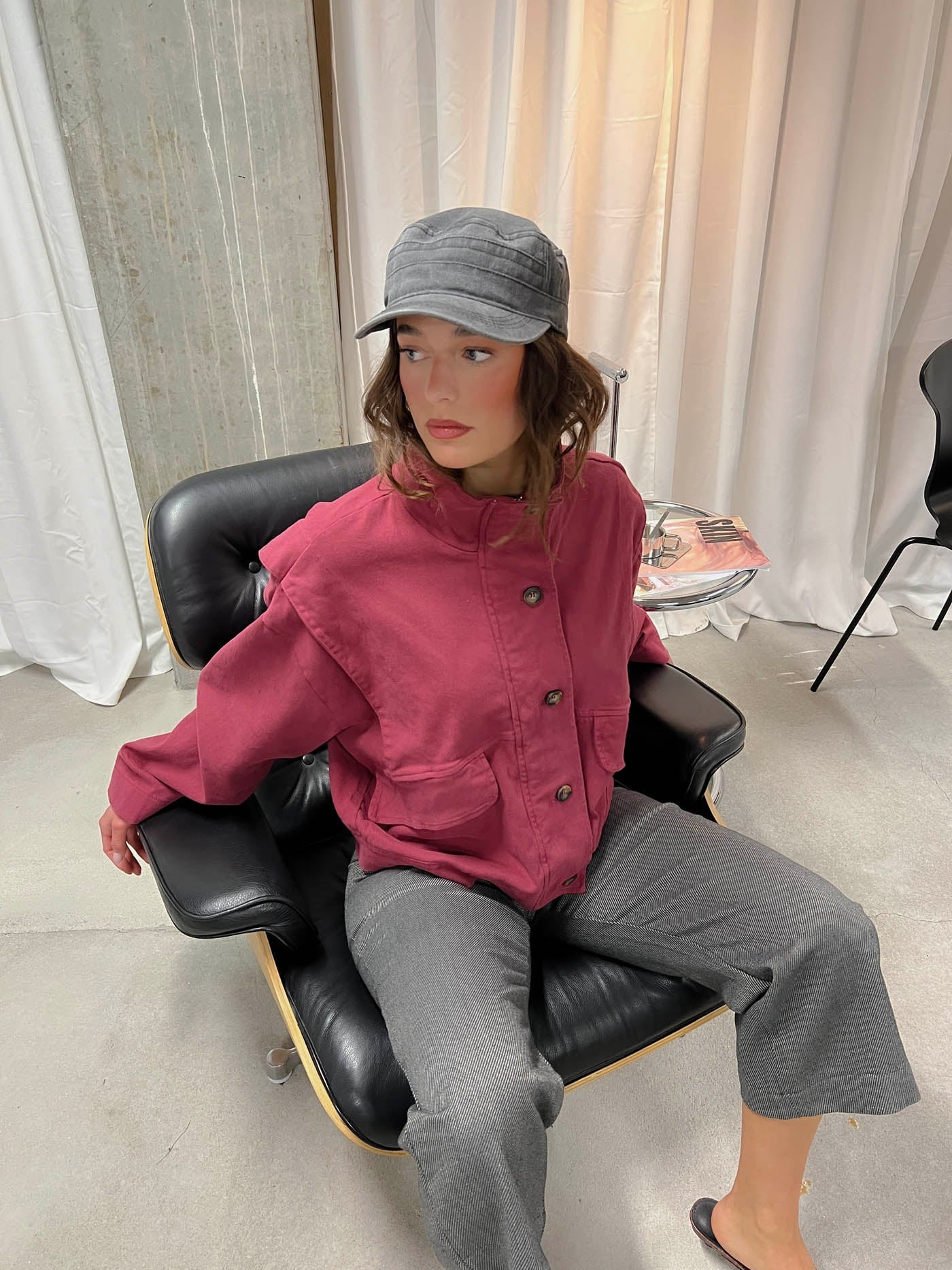 This short red denim jacket adds a warm and distinctive touch to your wardrobe. The jacket is designed with a high collar, full button closure, and statement chest pockets, giving it a modern and functional look. The cropped fit makes it ideal for layering and pairs beautifully with trousers, jeans, and dresses alike. The structured denim quality ensures a solid and stylish appearance, while still being comfortable to wear.