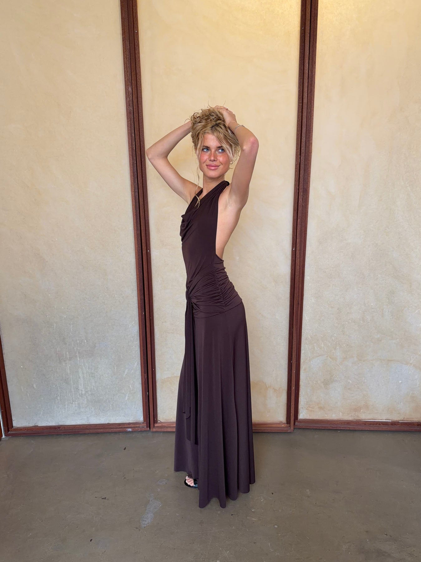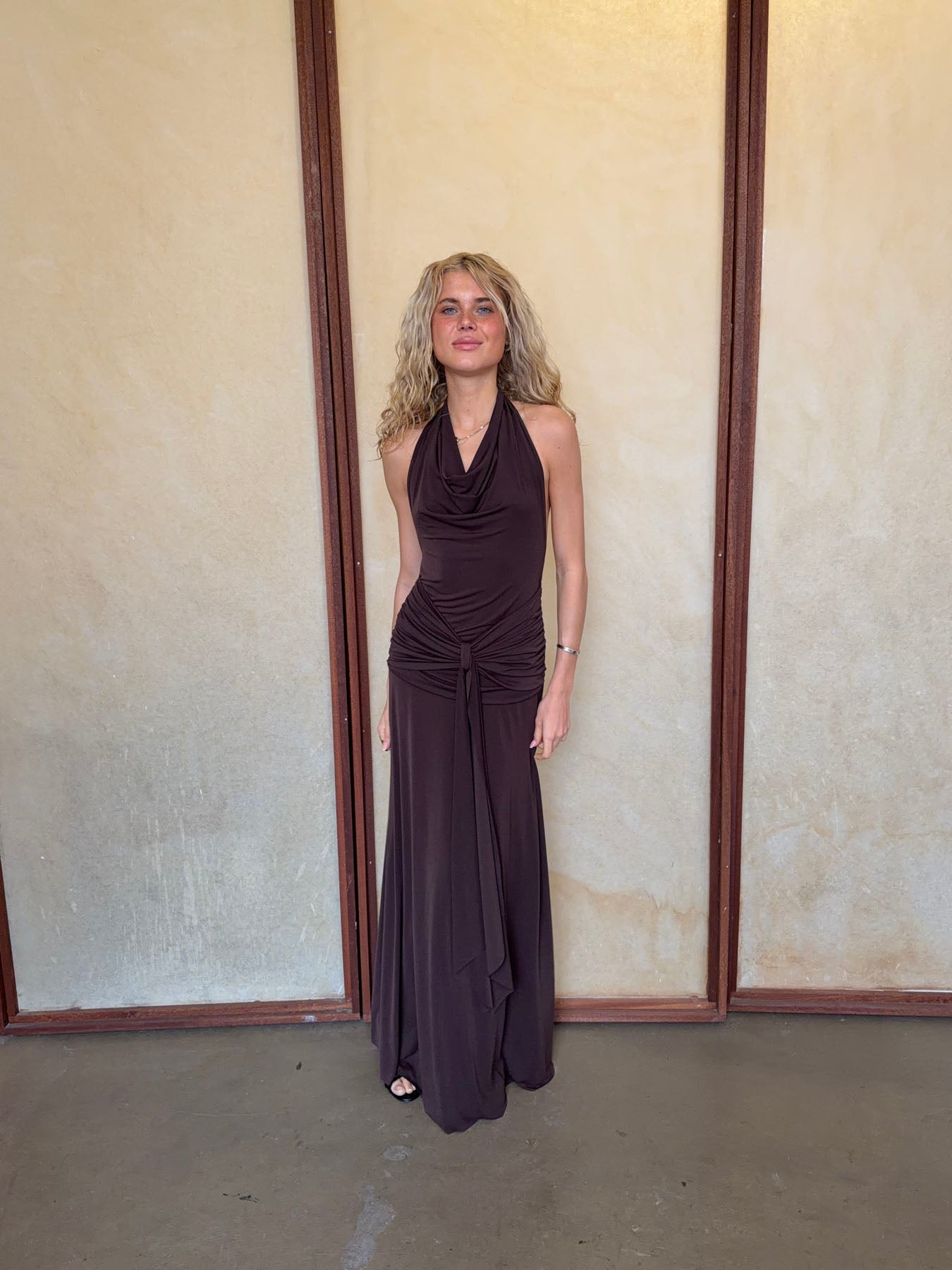 This beautiful maxi dress in a brown shade is the perfect combination of elegance and comfort. The dress is made from a soft, glossy, and lightly stretchable material that drapes beautifully along the body, creating a sophisticated look. The striking draping at the waist flatters the figure, while the wide tie belt allows you to adjust the fit and create a feminine silhouette.