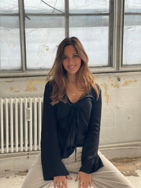 The most beautiful satin blouse with long and wide sleeves and a loose fit. The blouse has tie details at the front and a v-neckline.