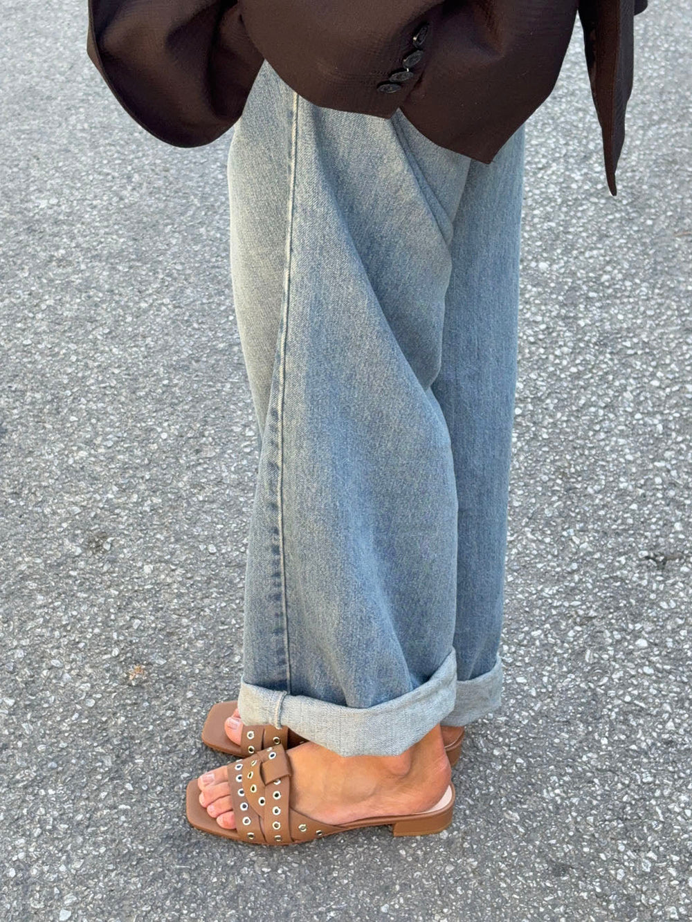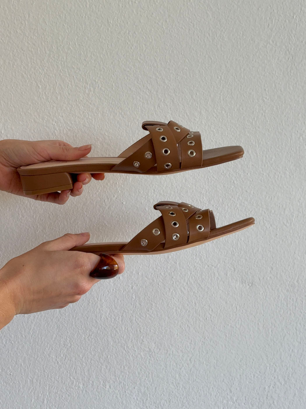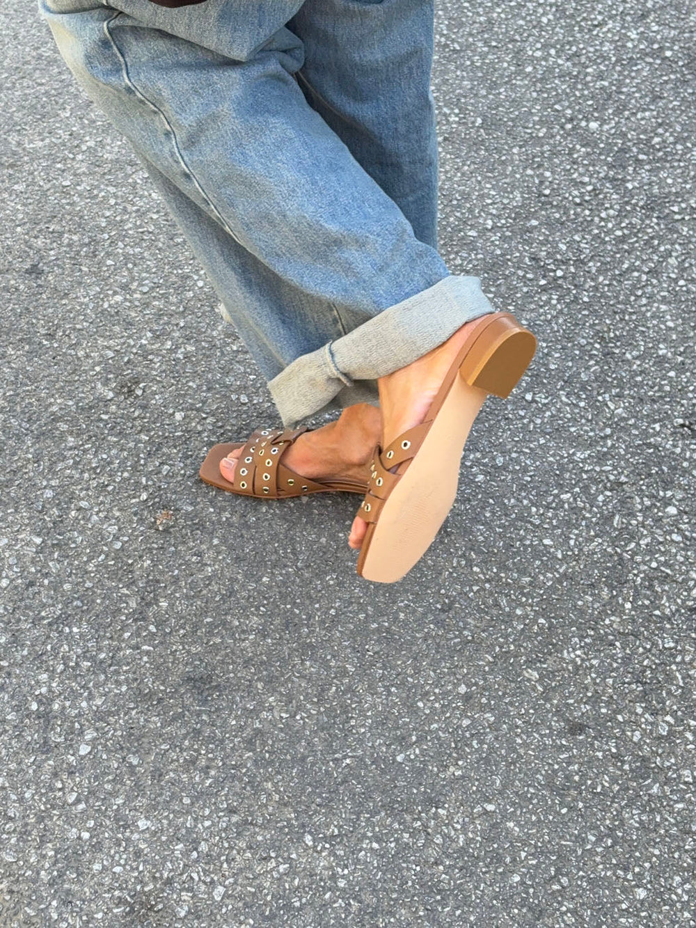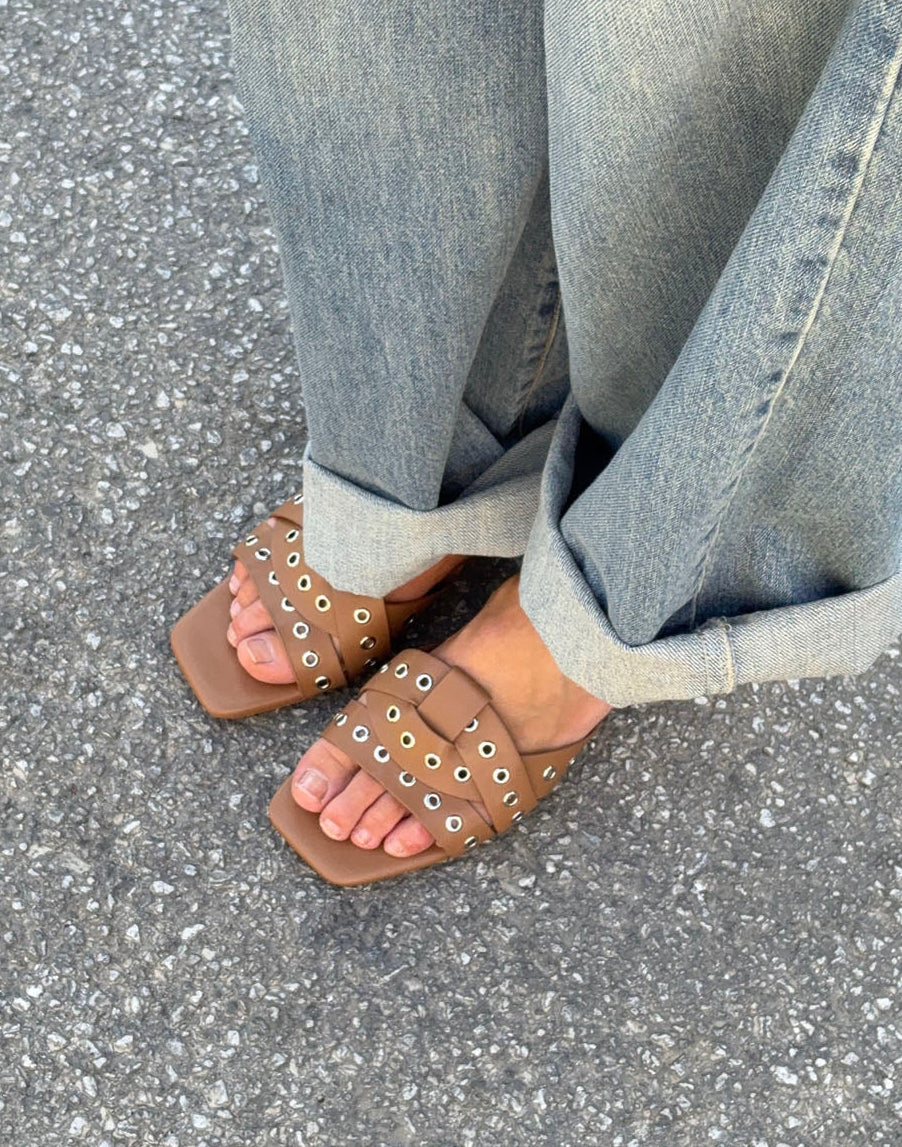 These caramel-brown sandals with metal rings combine feminine elegance with a modern, edgy touch. The wide, crossed straps are adorned with silver ring details that add character and attitude to the design, while the square toe and low heel create a sleek, contemporary look.