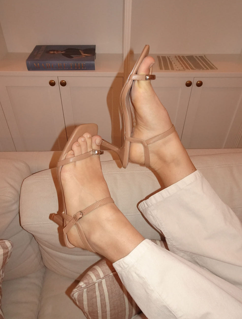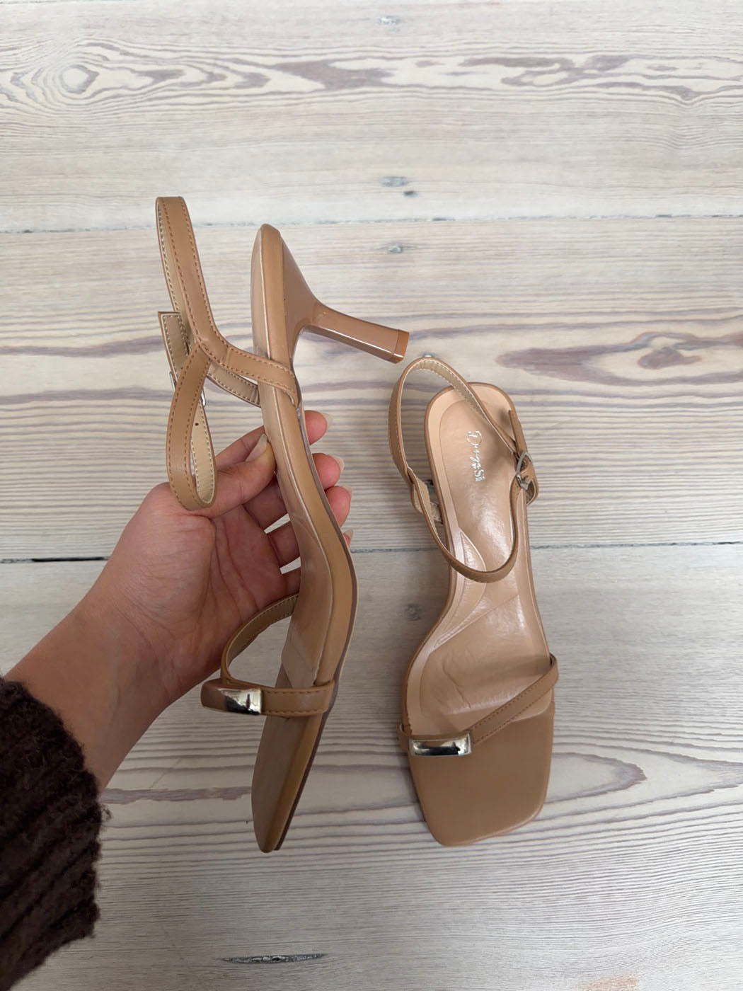 These elegant beige sandals combine minimalist design with a touch of glamour. The delicate metal detail at the front adds a modern and exclusive feel, while the thin straps and sleek heel highlight a feminine and refined look. Perfect for a night out, a dinner, or any festive occasion.