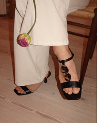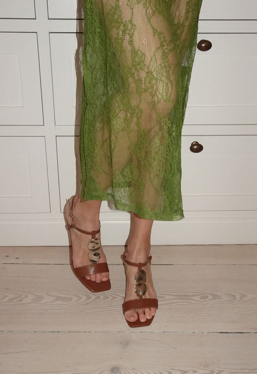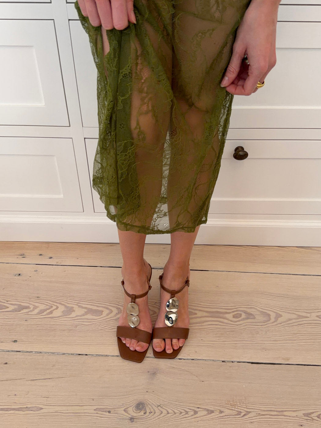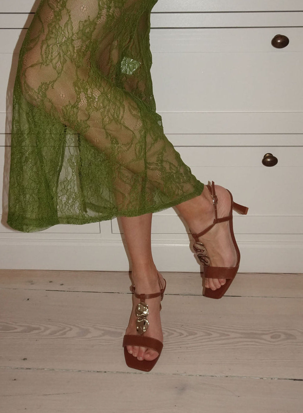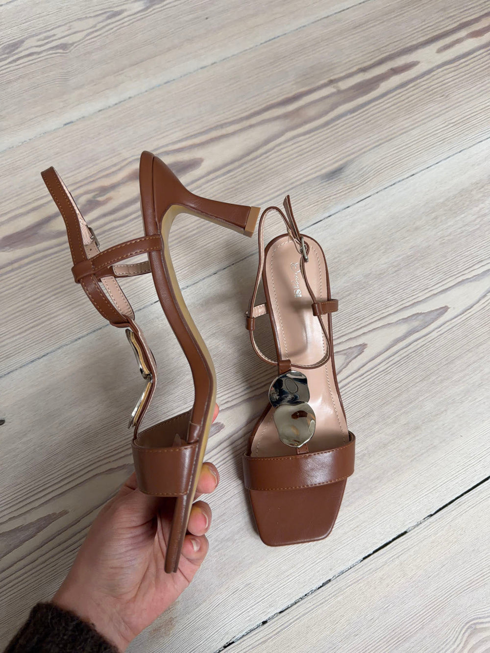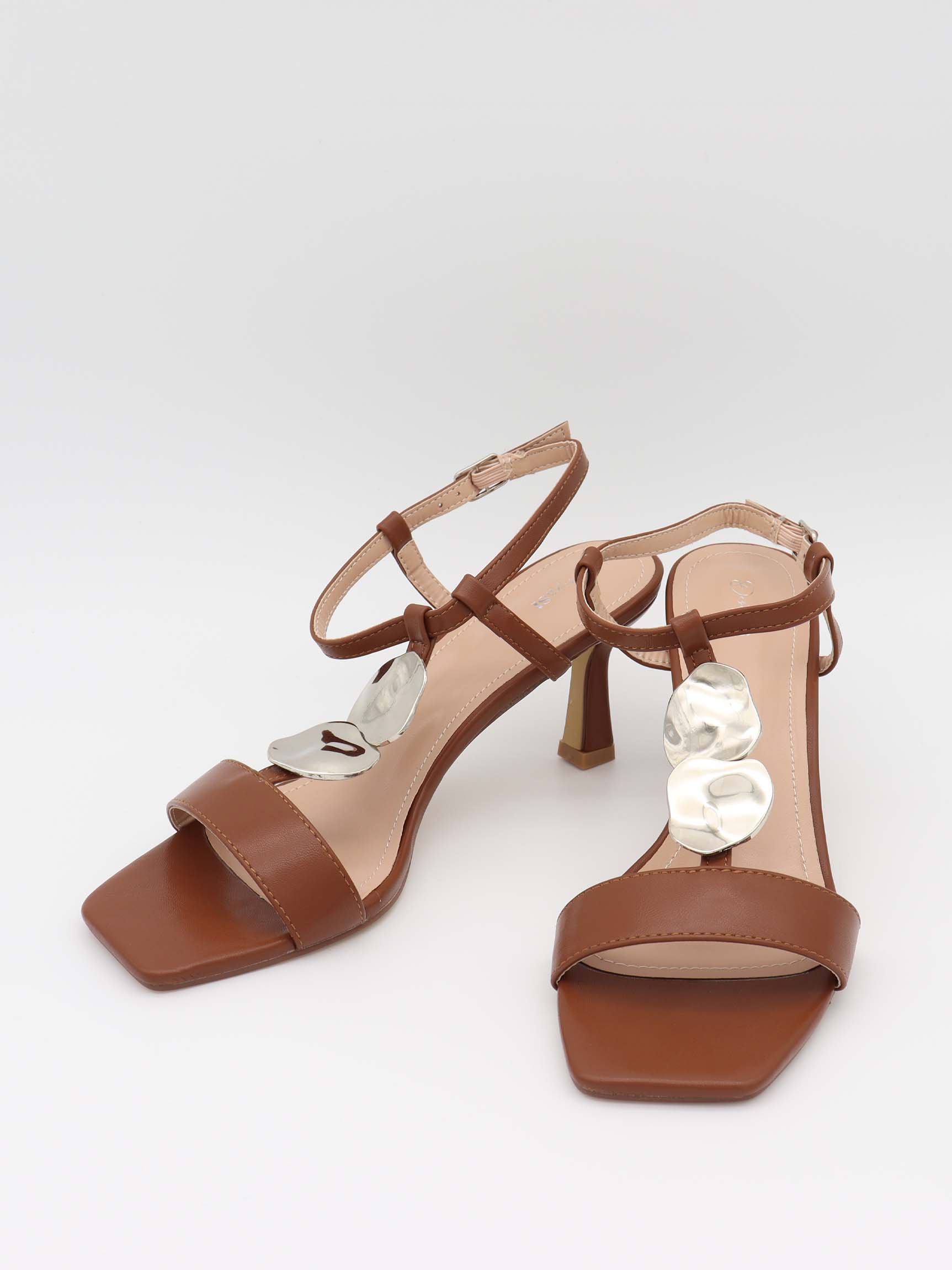 These stylish sandals in a warm brown shade combine the classic strappy heel with exclusive details. The three silver-toned decorative elements on the forefoot add a glamorous and eye-catching touch, while the delicate straps create a feminine and sophisticated look.
