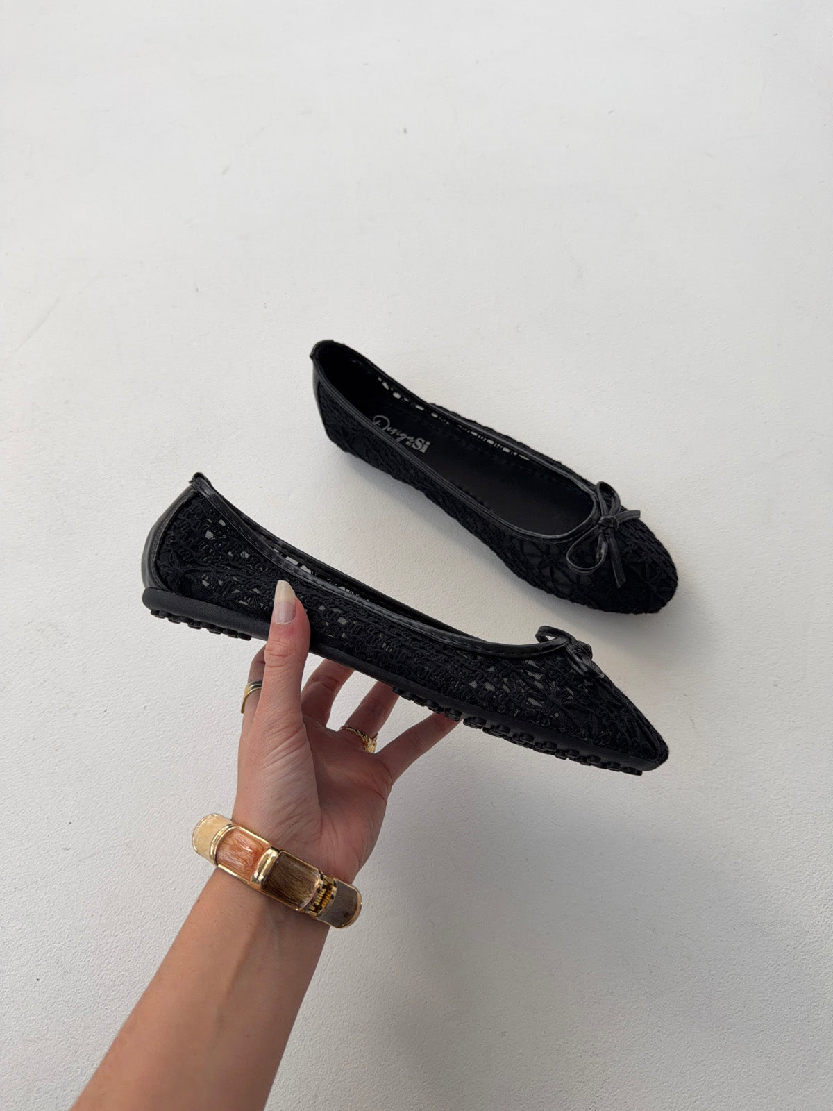 Capuchina ballerinas are an elegant and timeless choice that combine comfort with feminine design. Made from black, slightly perforated material with a subtle pattern, they give the shoe a sophisticated and airy look. The classic rounded toe and the delicate bow detail at the front complete the design, while the soft sole ensures great comfort – perfect for both everyday wear and more elegant occasions.