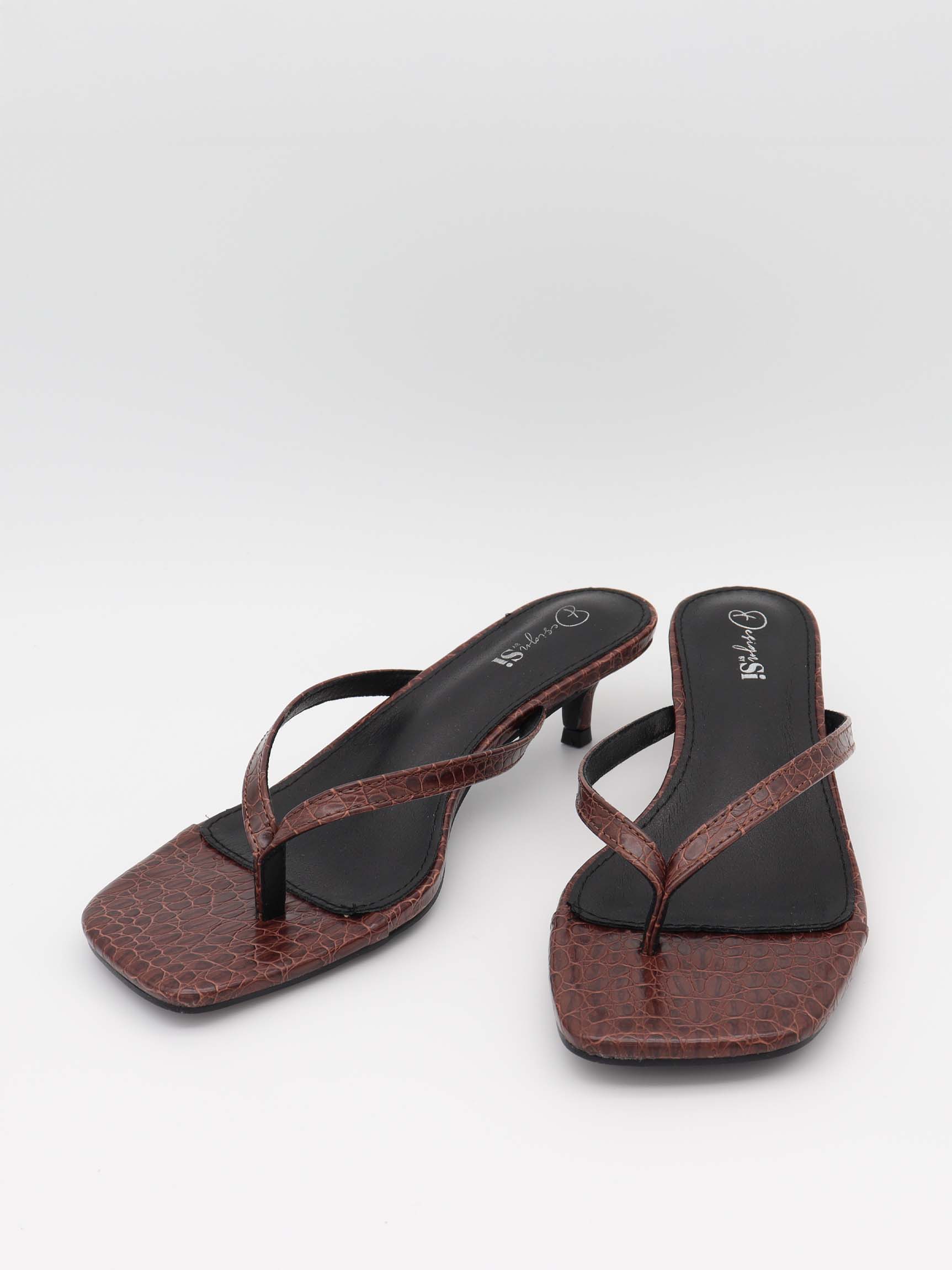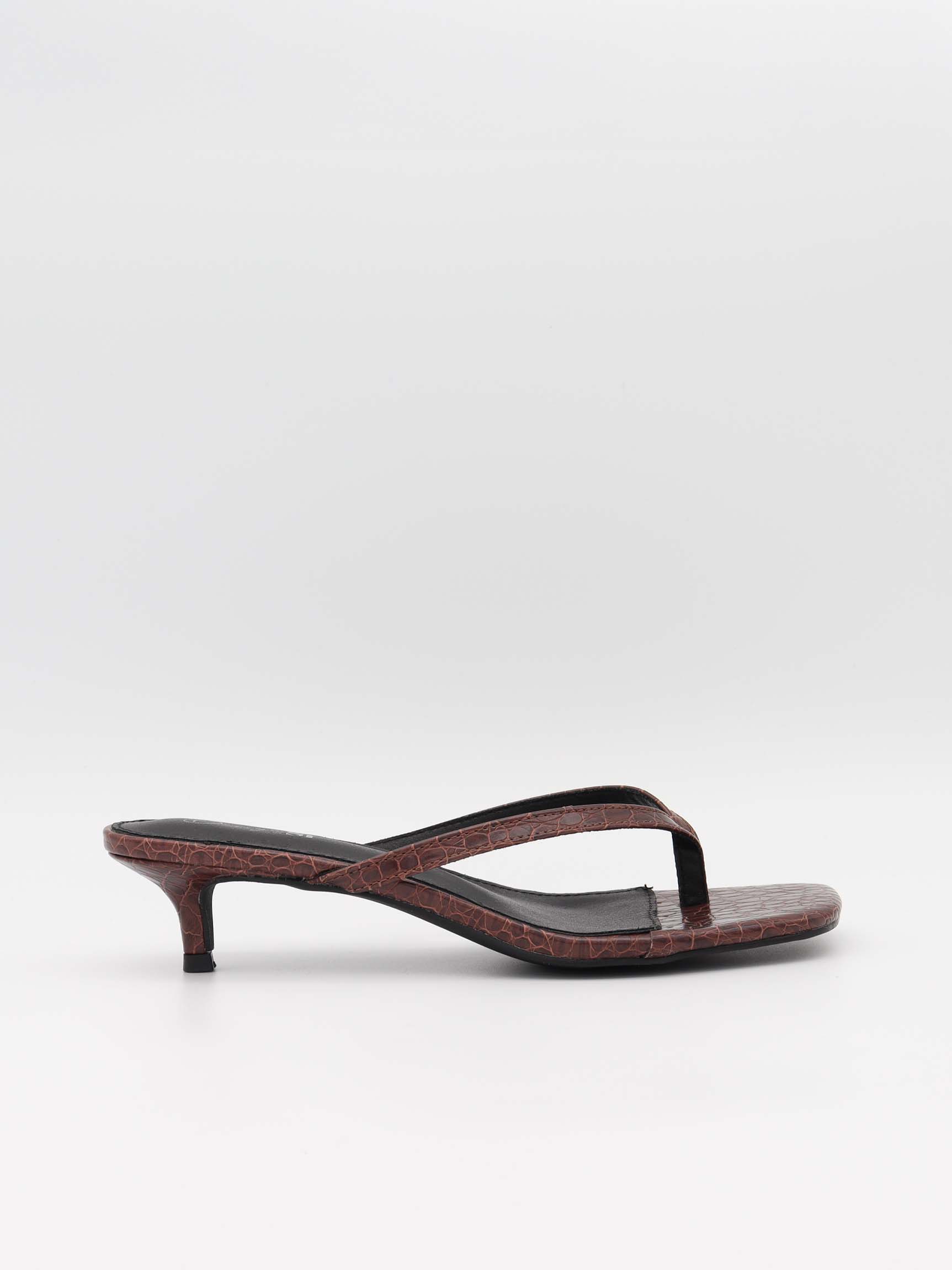 These mules combine timeless elegance with a modern twist. The simple design with the square toe and delicate straps creates a sophisticated and feminine look. The brown surface with a crocodile-embossed texture adds an exclusive and luxurious touch, making them ideal for both everyday wear and special occasions. The low heel provides comfortable support, while the minimalist design makes them easy to style with any outfit. A pair of mules that effortlessly blends style and comfort.