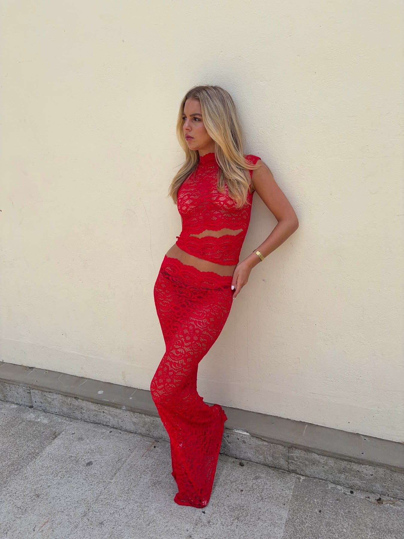 Perfect for festive occasions and evening wear alike – style it with the matching skirt for a complete look or pair it with jeans and heels for a modern twist. The vivid red color exudes confidence and makes a statement, while the lightweight lace fabric feels airy and luxurious. Style it with the matching Marisol bottom or wear it on its own.