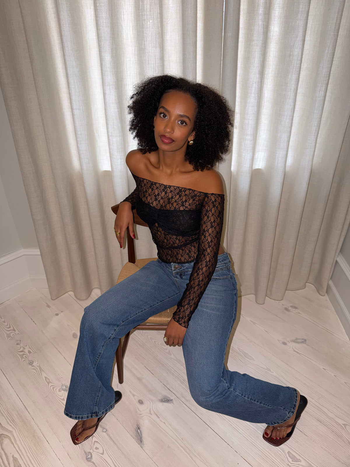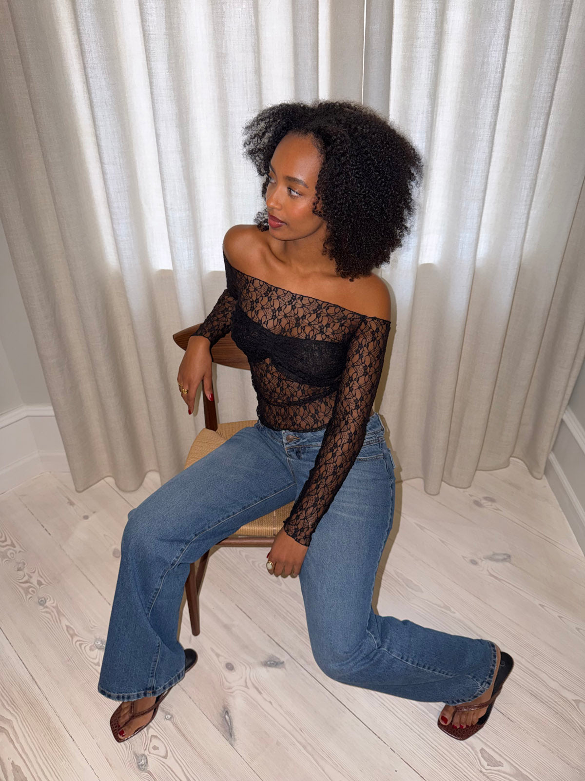 Black lace blouse in off-shoulder. The top has an extra layer of lace on the chest, so it´s less see-through.