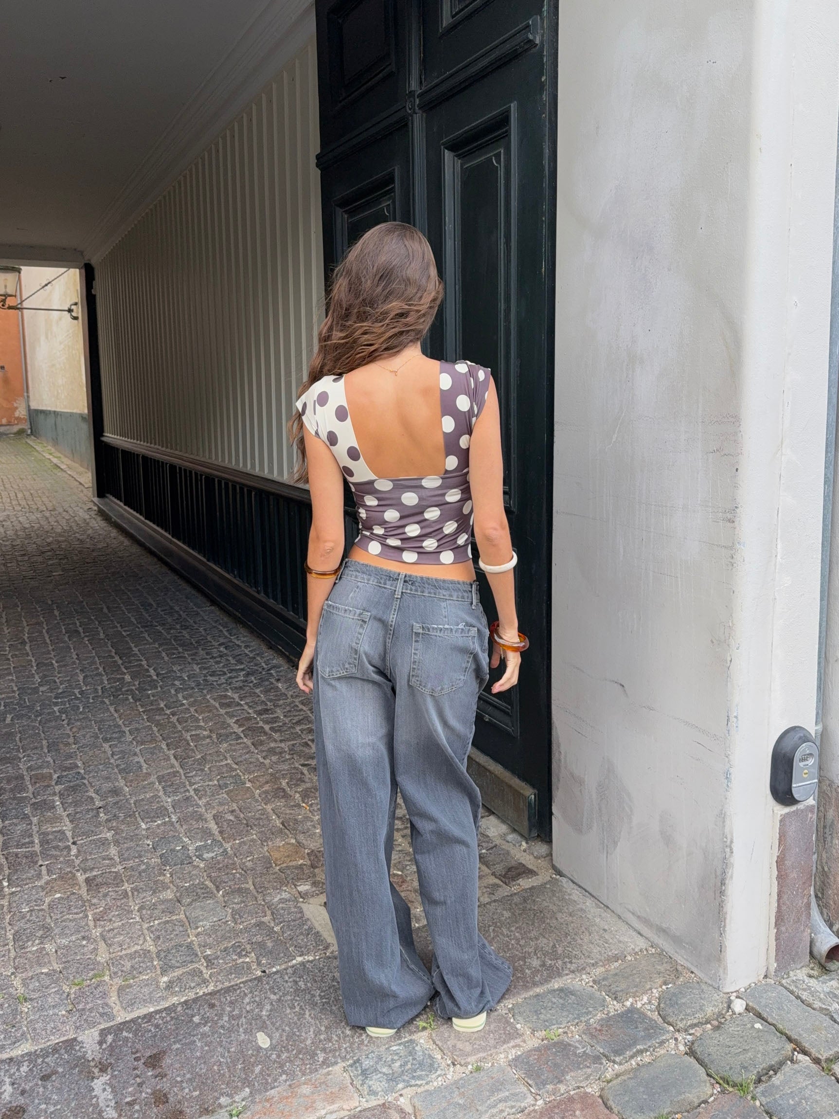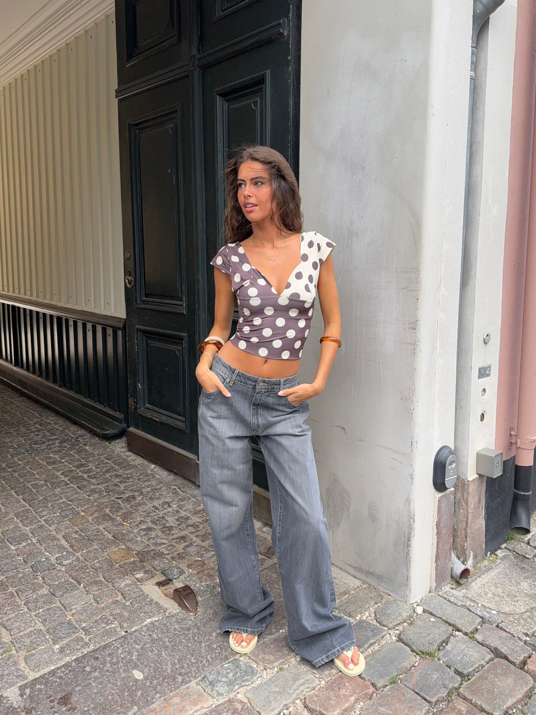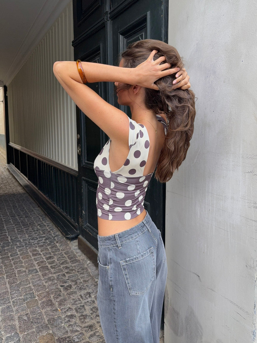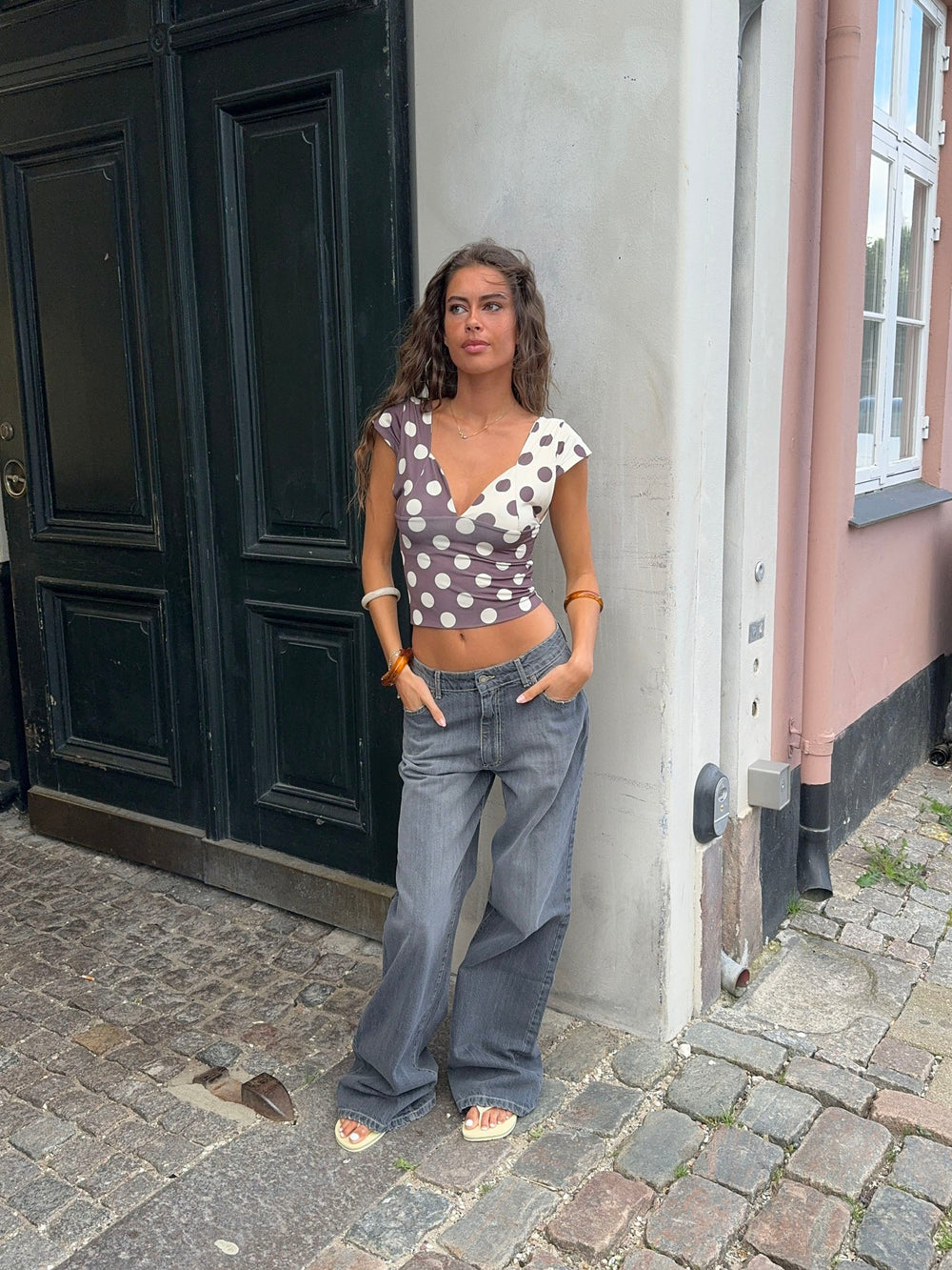 Our Nickeline V-neck top is a feminine and timeless piece that blends classic style with a modern touch. The polka dots and the combination of brown and off-white create an elegant look. The V-shaped neckline beautifully highlights the neck and offers a flattering fit, while the light and airy fabric ensures all-day comfort. The top has a slim fit, making it ideal for more festive occasions. Style it with jeans for a casual look.