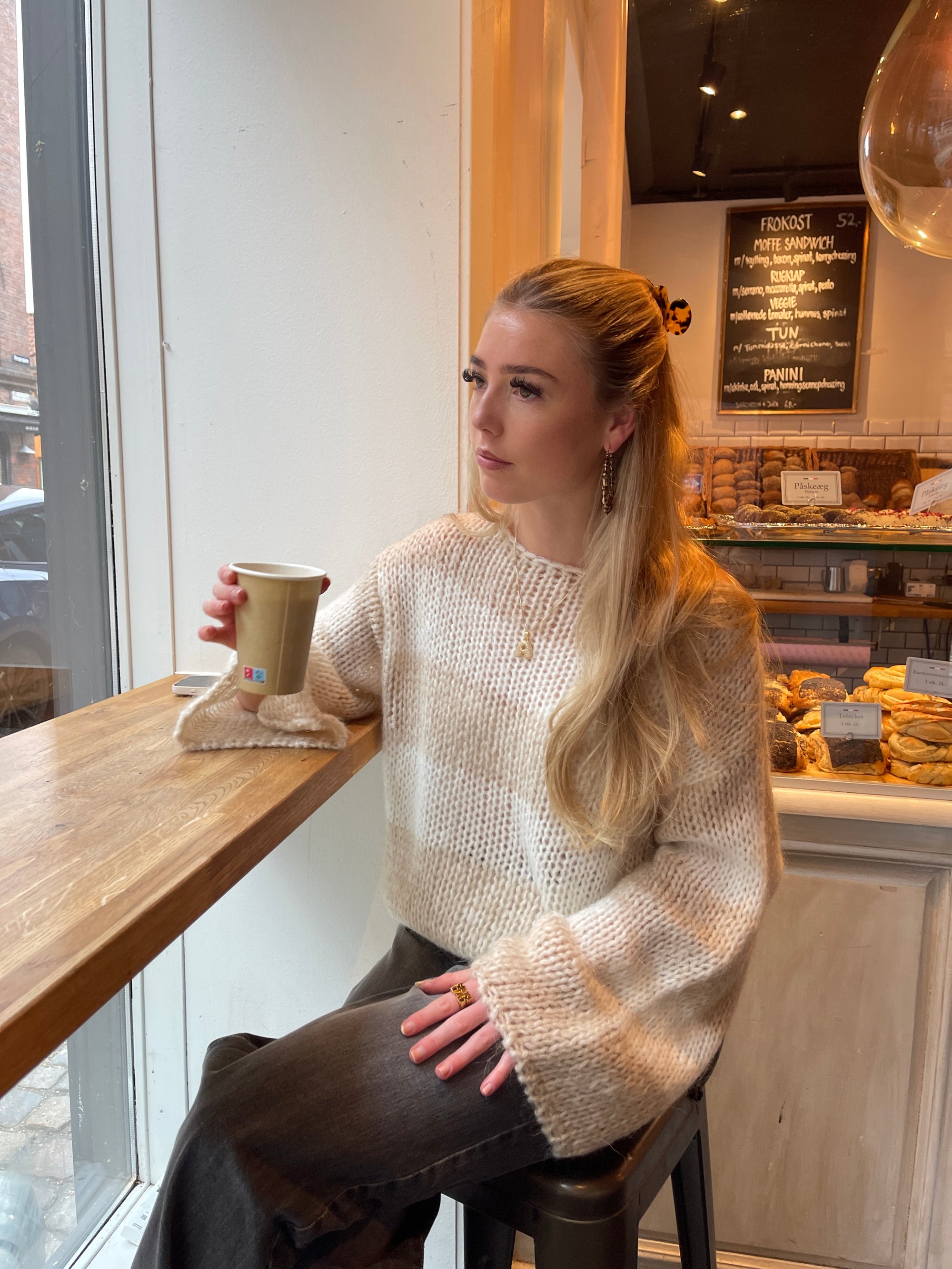 This knitted sweater has a loose and oversized fit and is perfect for all seasons, as you can wear it in the cold winter months as well as on a cold summer evening. The knitted sweater consists of long wide sleeves and is designed with a wide round neckline.