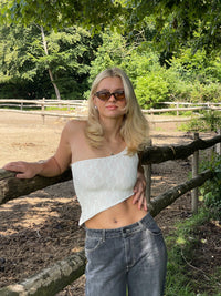 This one shoulder top has a short or tight fit. The top has the cutest lace details and is longer on one side.