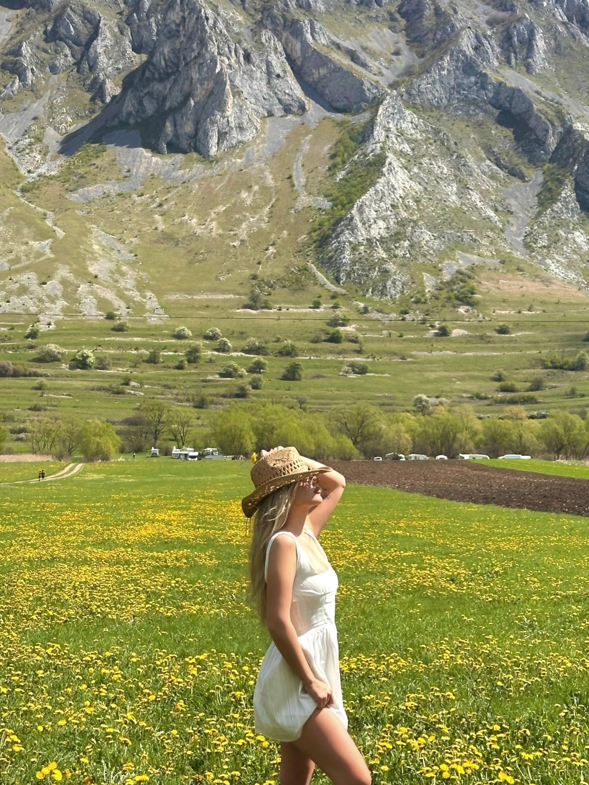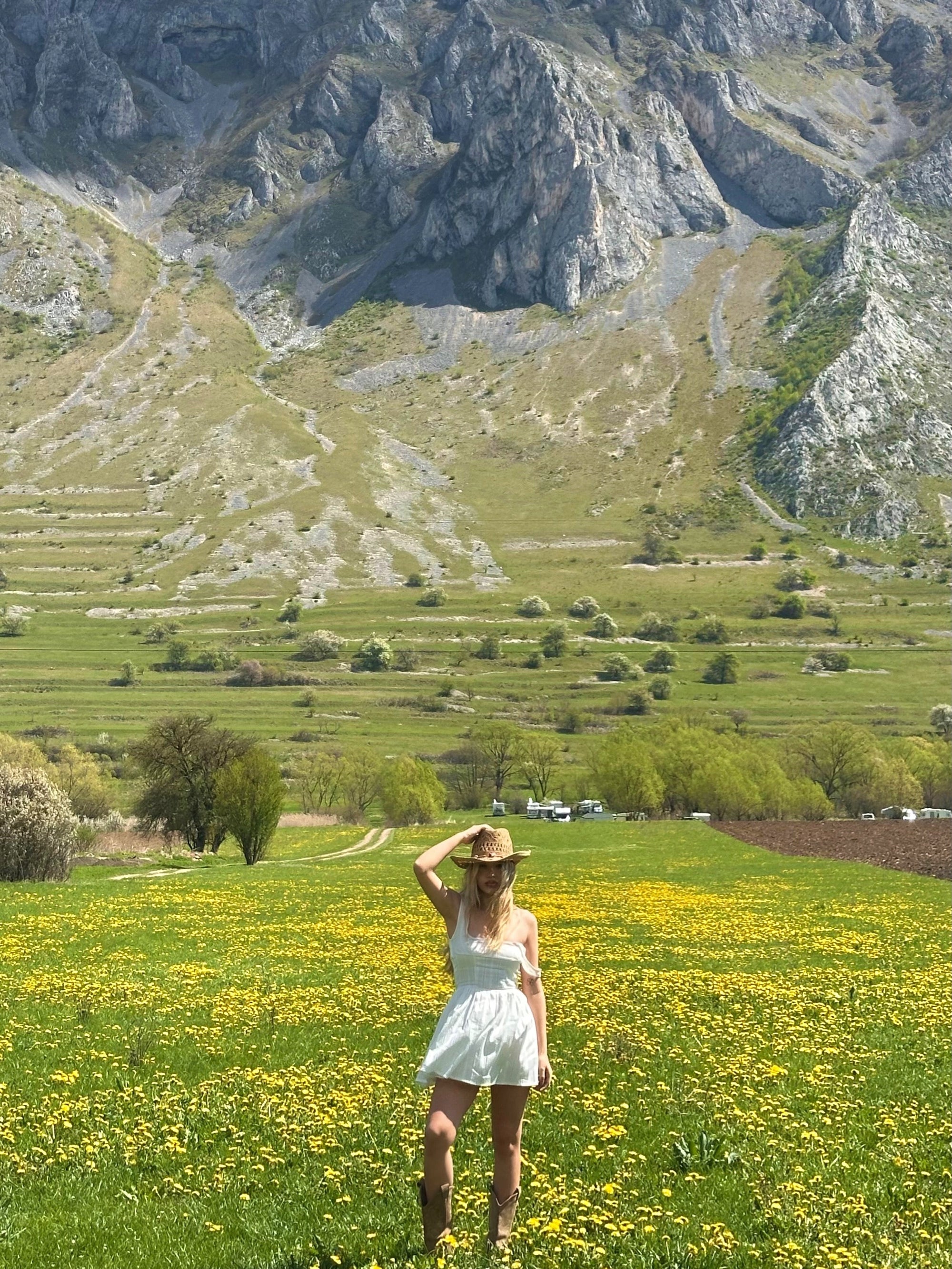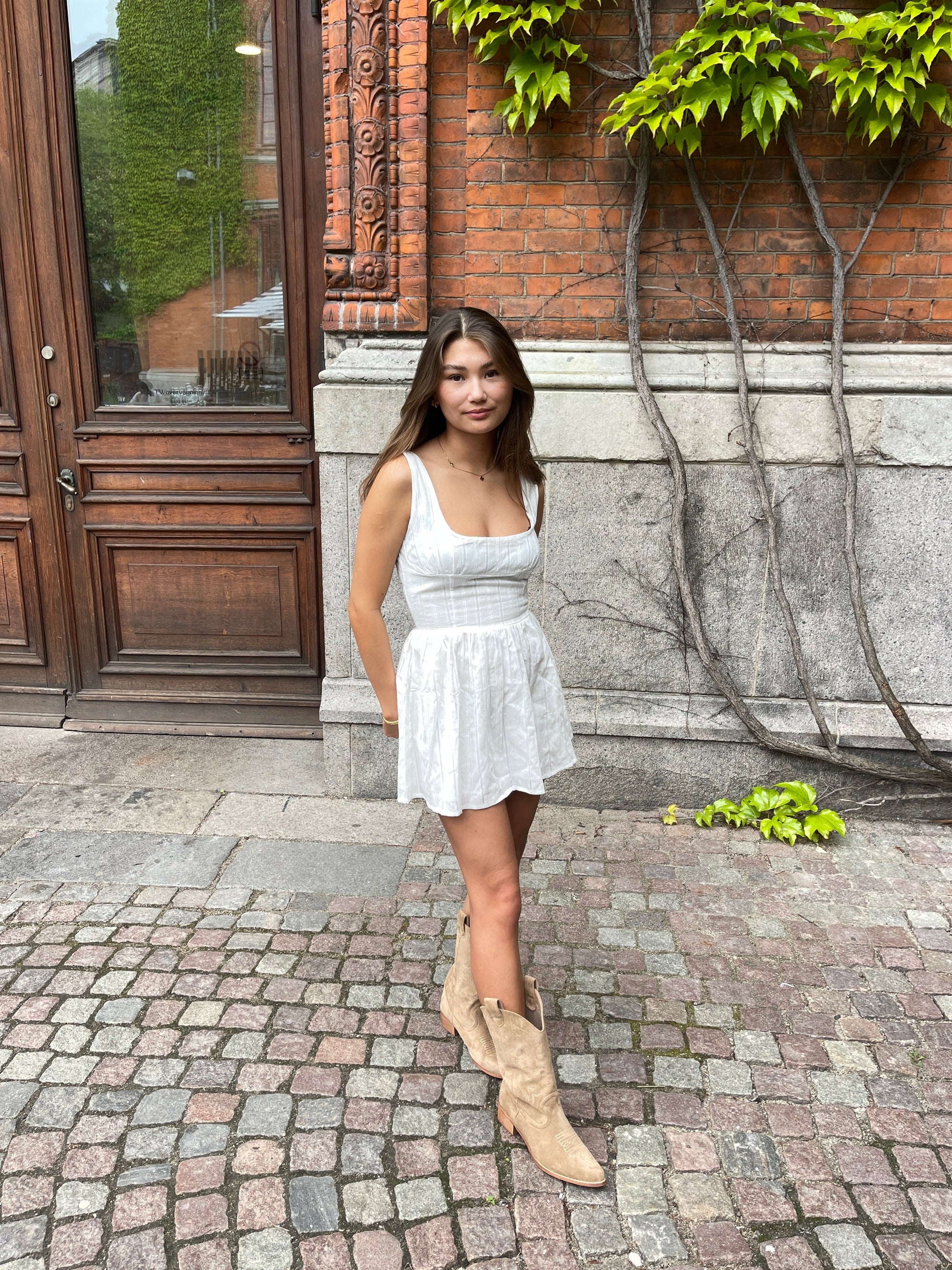 The cutest summer dress with a short length. The dress has a form-fitting fit and a deep neckline.