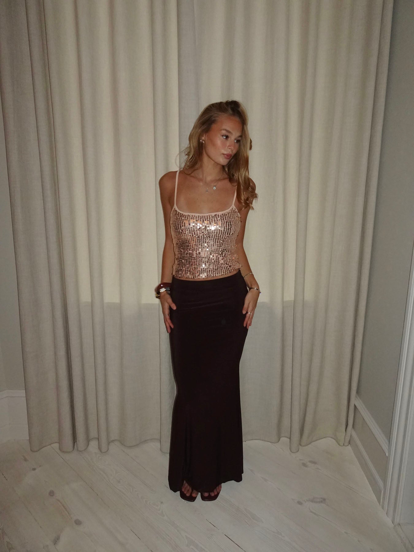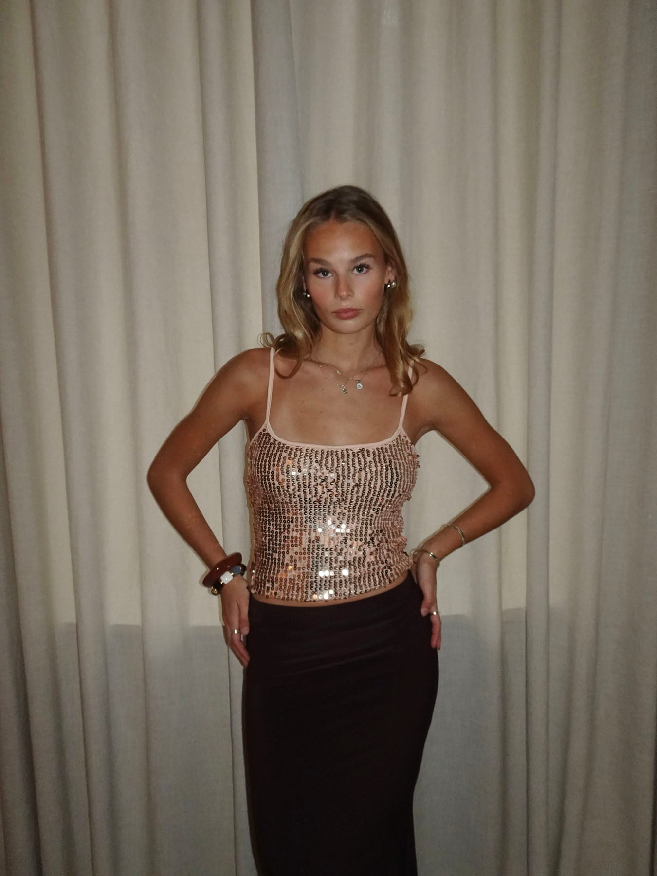 This stunning sequin top is covered in sparkling gold and nude-colored sequins that catch the light beautifully. The stretchy material and adjustable straps make the top comfortable to wear while giving it a glamorous and exclusive look.