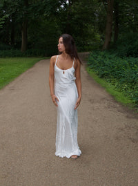 Long orange dress in satin with thin straps. The dress has the prettiest details such as a hole at the chest, which helps to give a unique and classic look.