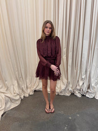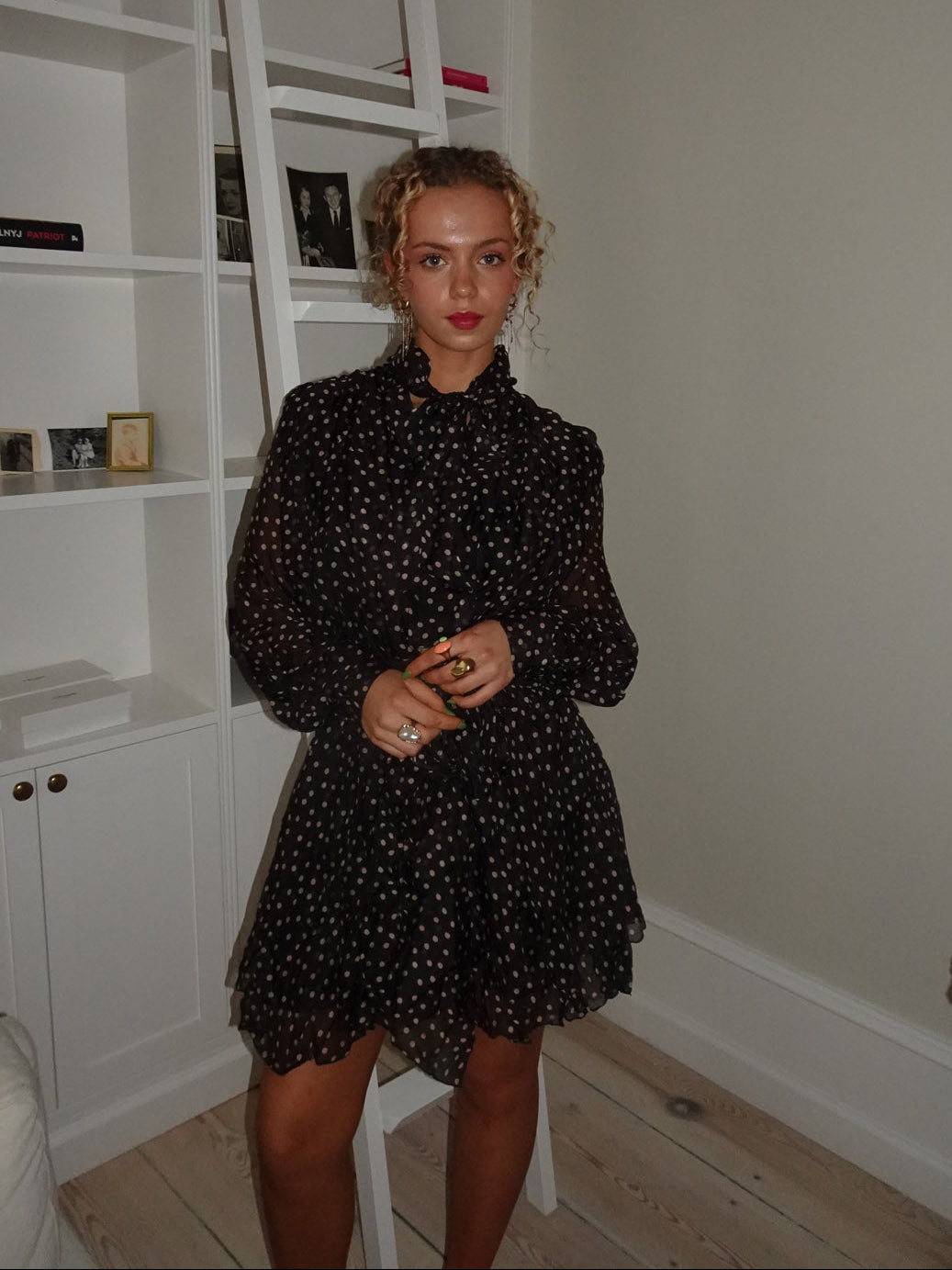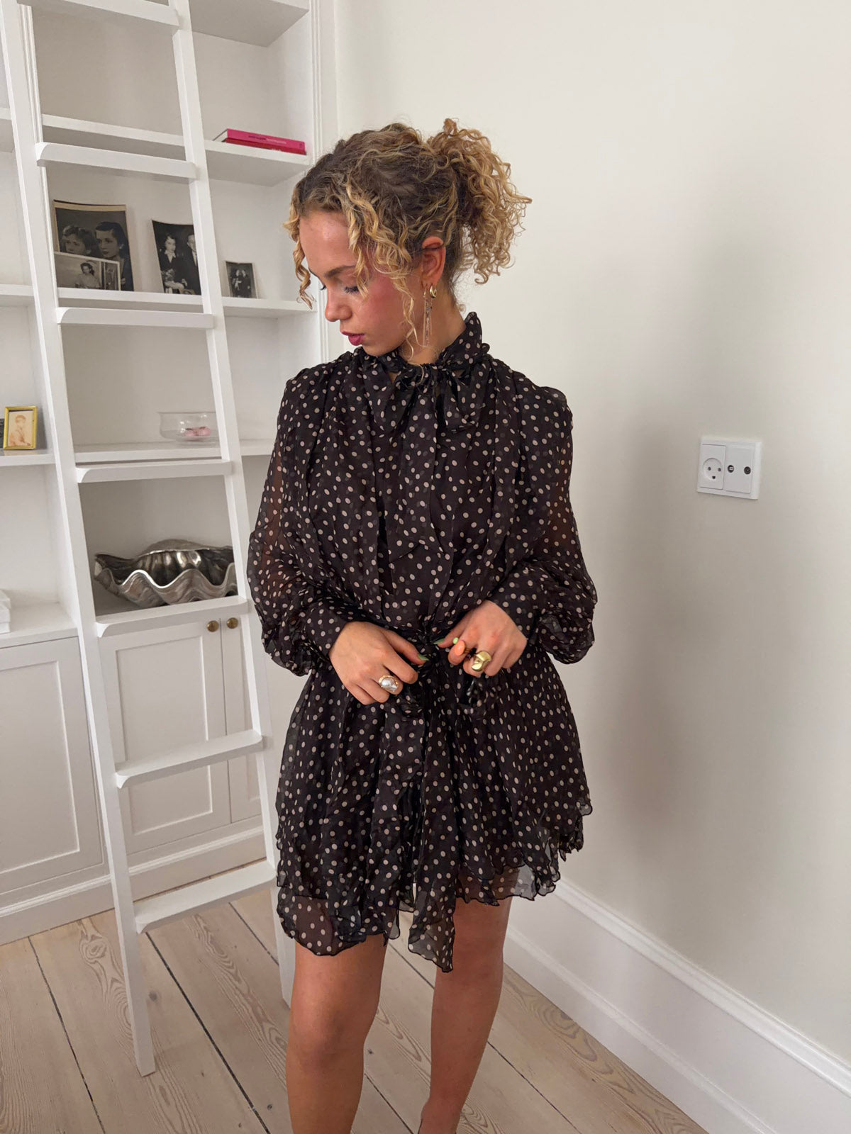 This beautiful black dress with cream-colored dots combines romantic details with a playful and airy expression. It is designed in lightweight, semi-transparent chiffon with light dots and features a spacious, gathered construction that gives the dress a soft and voluminous drape.