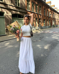 Our Kiera skirt is the perfect brown long skirt, with an elasticated waist. It falls super nicely on the body and gives a sweet summery look.