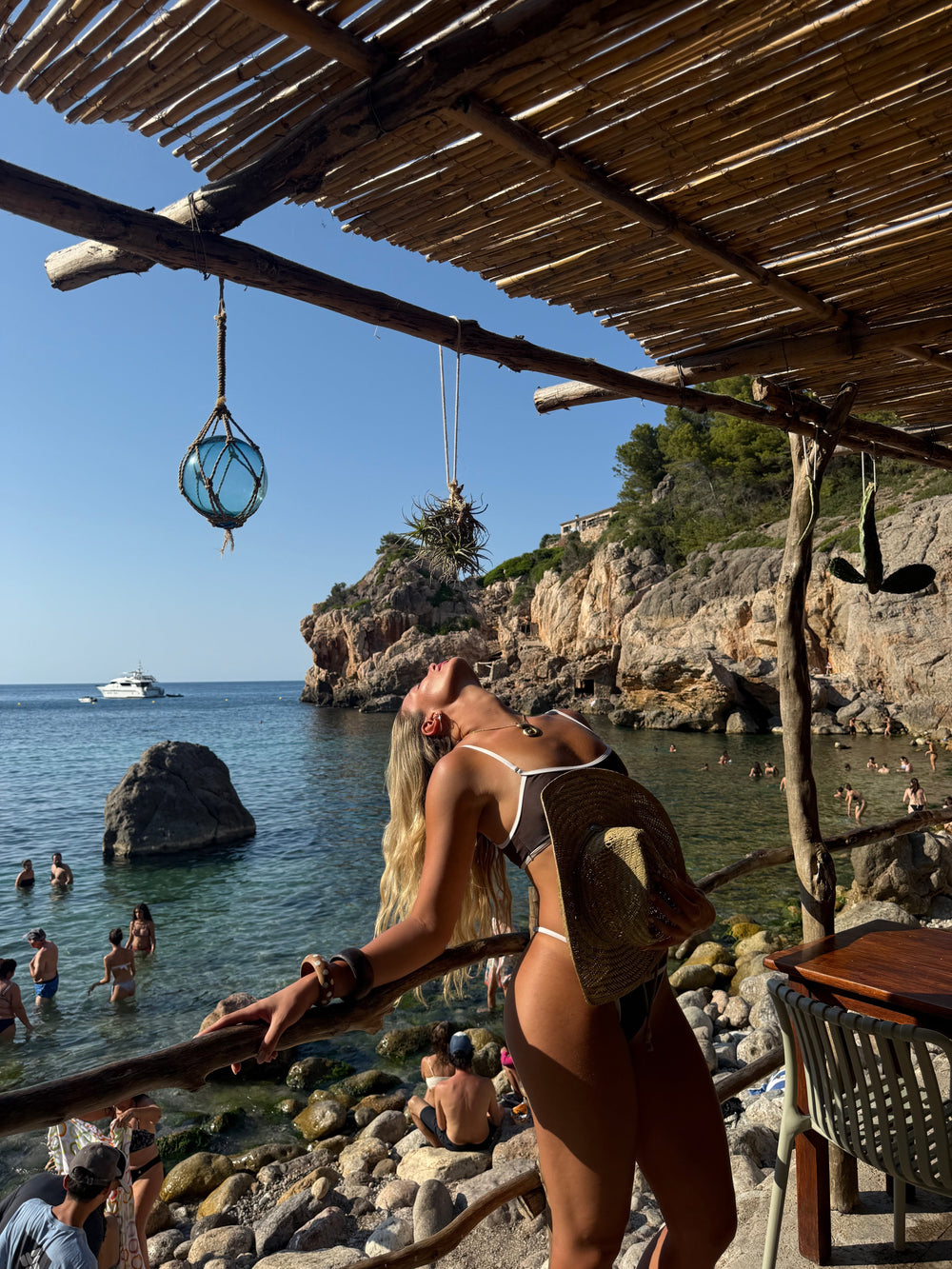 Our Corinna consists of a top with thin straps and a bottom. The bikini has white edges and is available in black and brown.