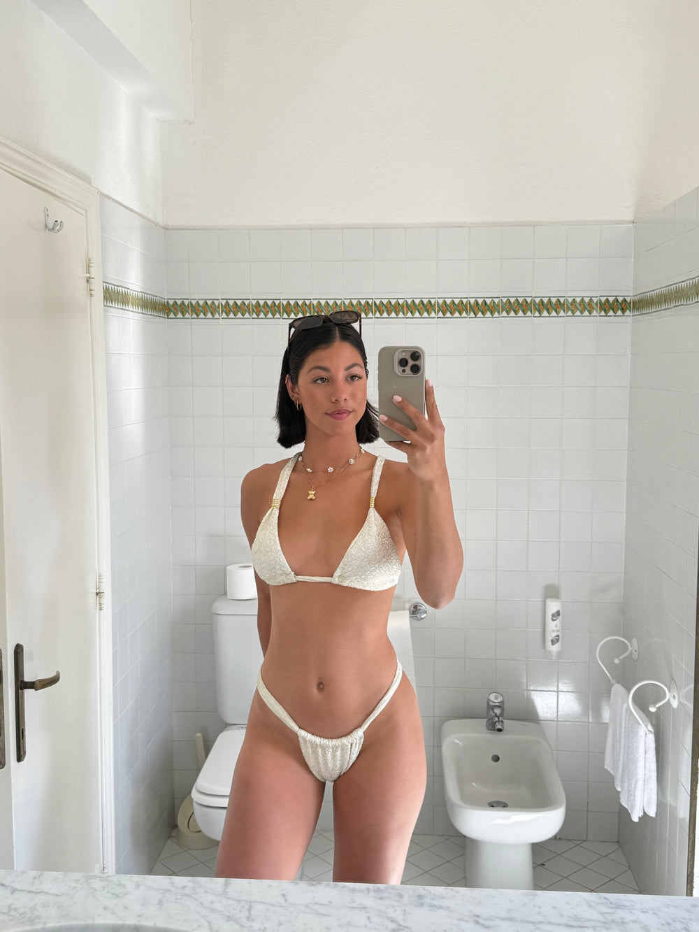 Our Bruna bikini bikini in beige/off white consists of a top with wide straps and gold details. It can be tied at the back and is adjustable. It is in a fine shimmer material.