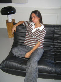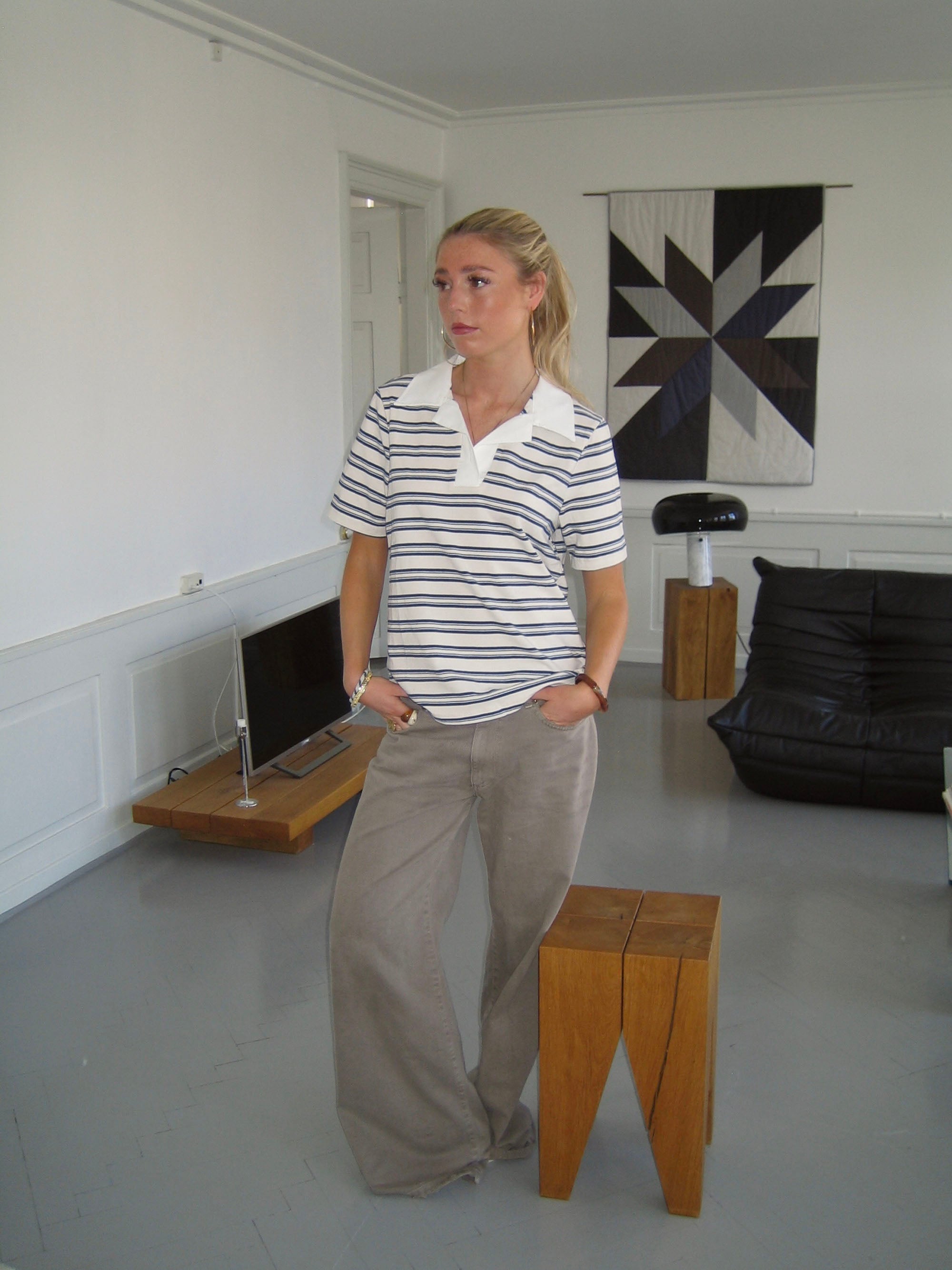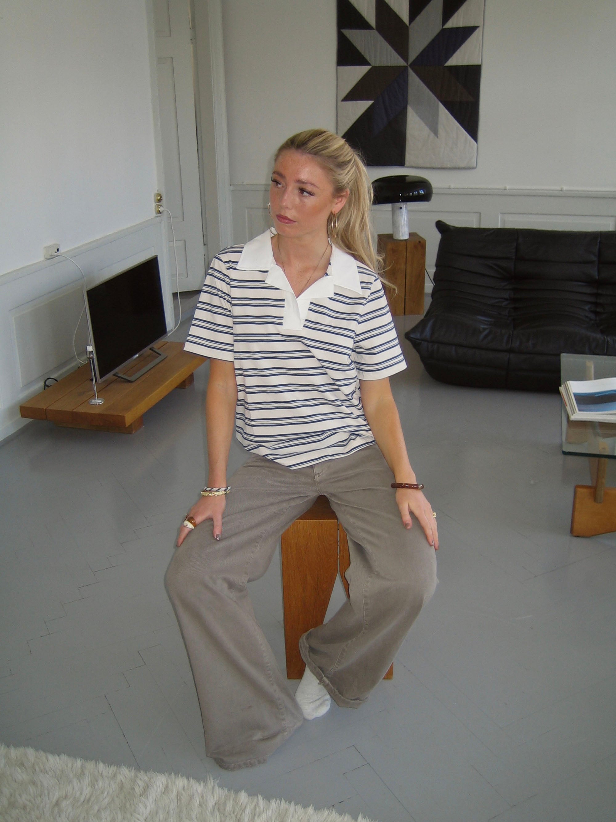 Our striped polo is your new go-to. The deep blue and brown tones combined with a sharp white collar create a sophisticated yet relaxed look. It can be styled with jeans, tailored trousers, or a simple skirt – perfect for both everyday wear and more formal occasions.