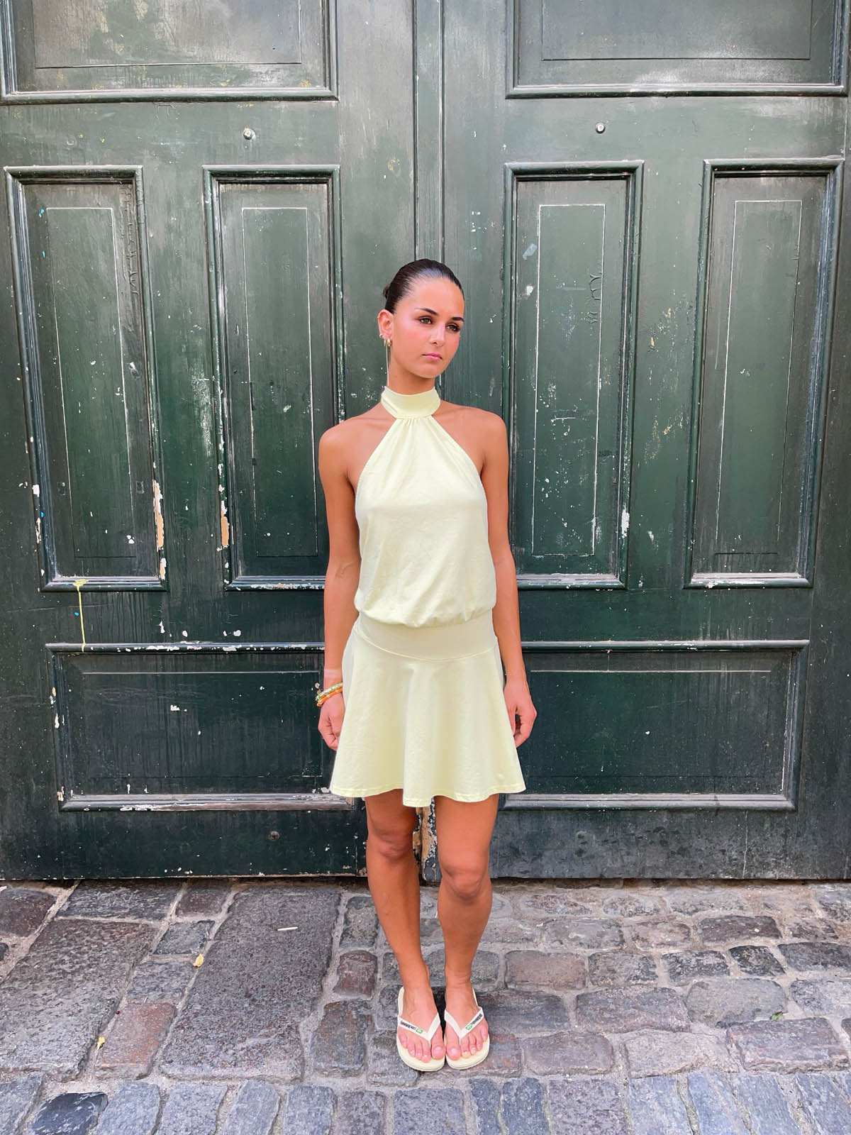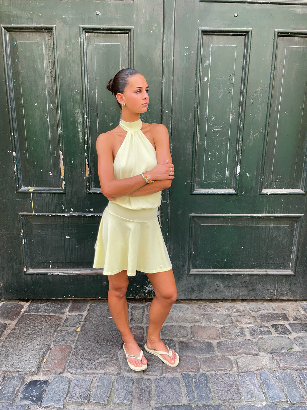 Our Kaiana dress is the perfect combination of cool and feminine. It’s designed with an elasticated waist that creates a flattering silhouette, and a wide tie belt that can be styled creatively around the neck or back. The open back and short, flowing skirt make it ideal for warm summer days or evenings when you want to feel both relaxed and stylish.