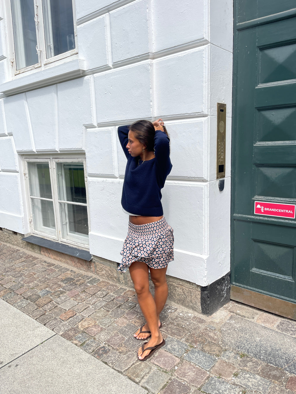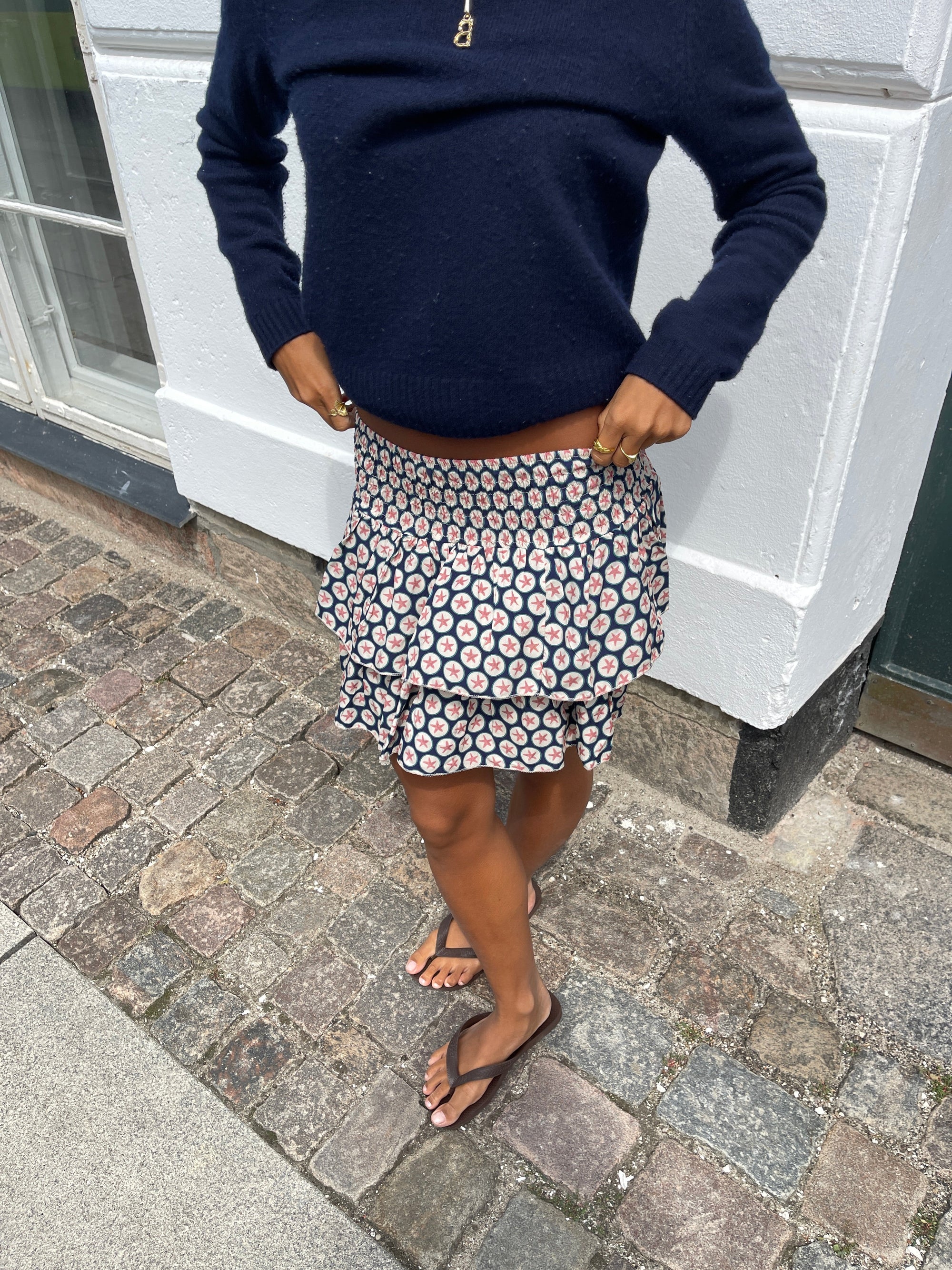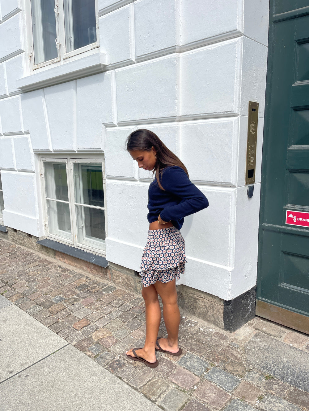 The prettiest skirt with ruffles and a cute print. The skirt has smock details at the waist and is short. Can be styled both mid- and low waisted. The perfect summer skirt!