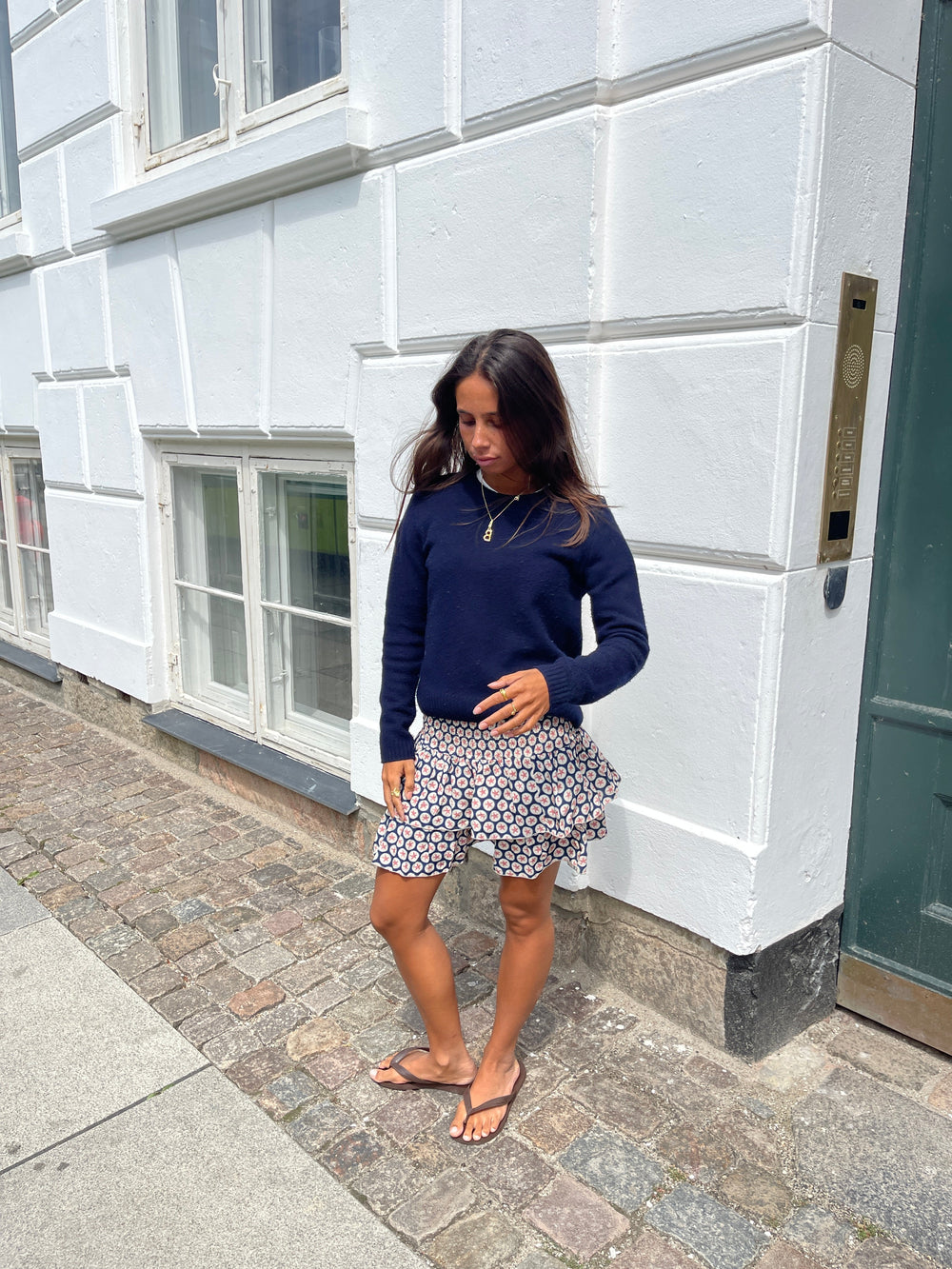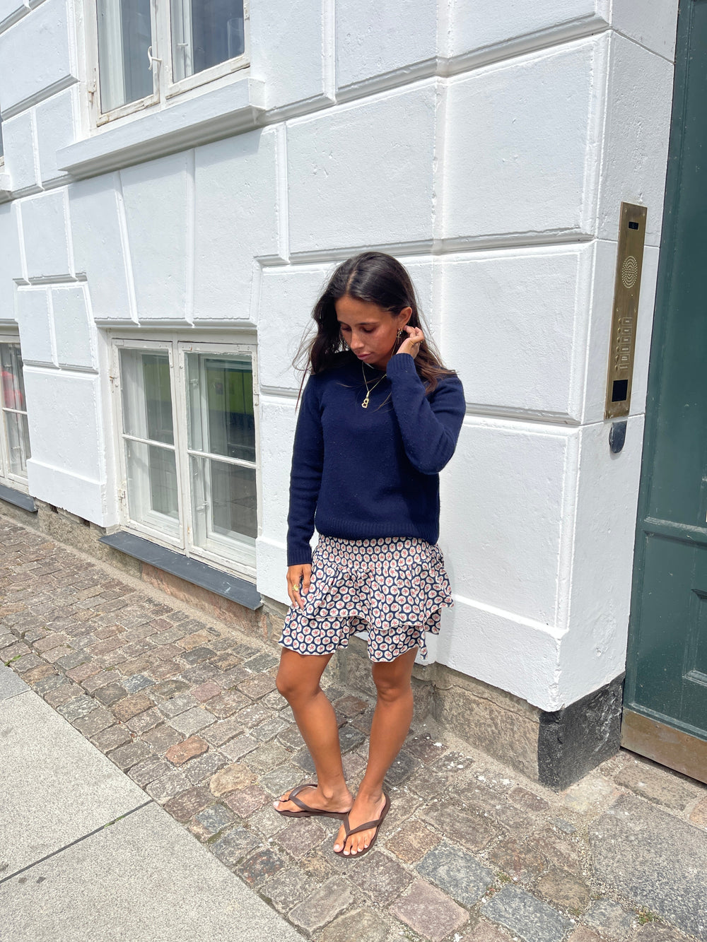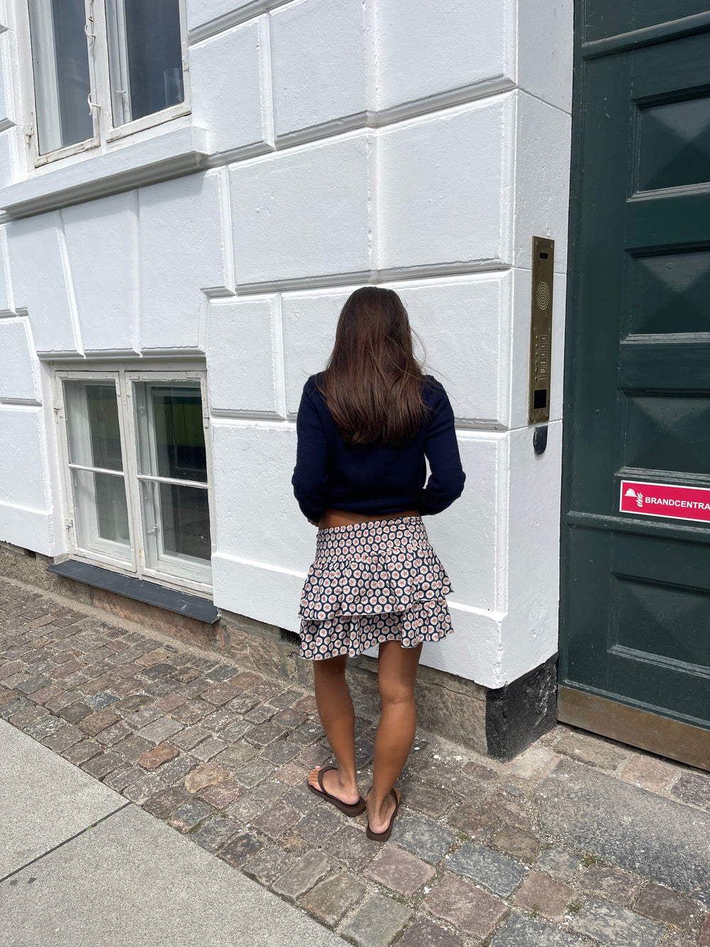 The prettiest skirt with ruffles and a cute print. The skirt has smock details at the waist and is short. Can be styled both mid- and low waisted. The perfect summer skirt!