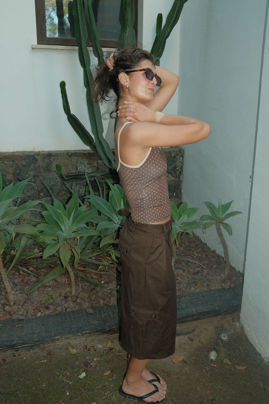This brown strap top with white polka dots is a feminine and playful addition to your wardrobe, combining comfort and charm in one design. The delicate light-colored trims along the straps and neckline create a beautiful contrast to the warm brown base, giving the top a refined, retro-inspired look. The light and soft fabric makes it comfortable to wear – perfect for warm summer days or relaxed everyday outfits.
