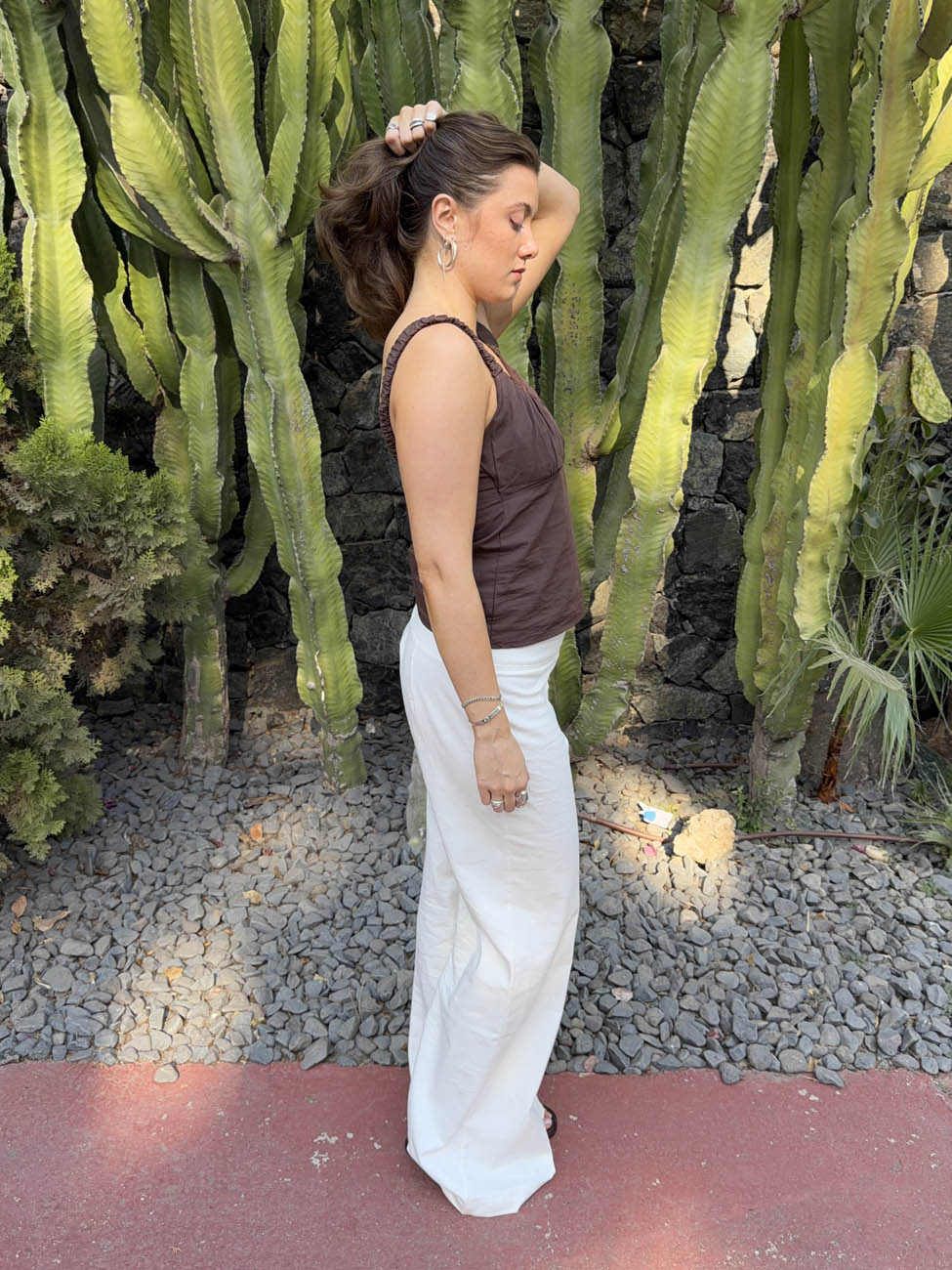 This feminine top in a warm brown shade combines simplicity with refined details. The soft cotton blend feels comfortable against the skin, while the ruched straps add a playful, modern twist. The lightly structured bodice drapes elegantly over the body, creating a relaxed yet stylish silhouette. A versatile piece that can be dressed up with high-waisted trousers and jewelry for the evening – or paired with shorts and sandals for a warm summer day. The muted color makes it easy to match with both light and dark tones in your wardrobe.