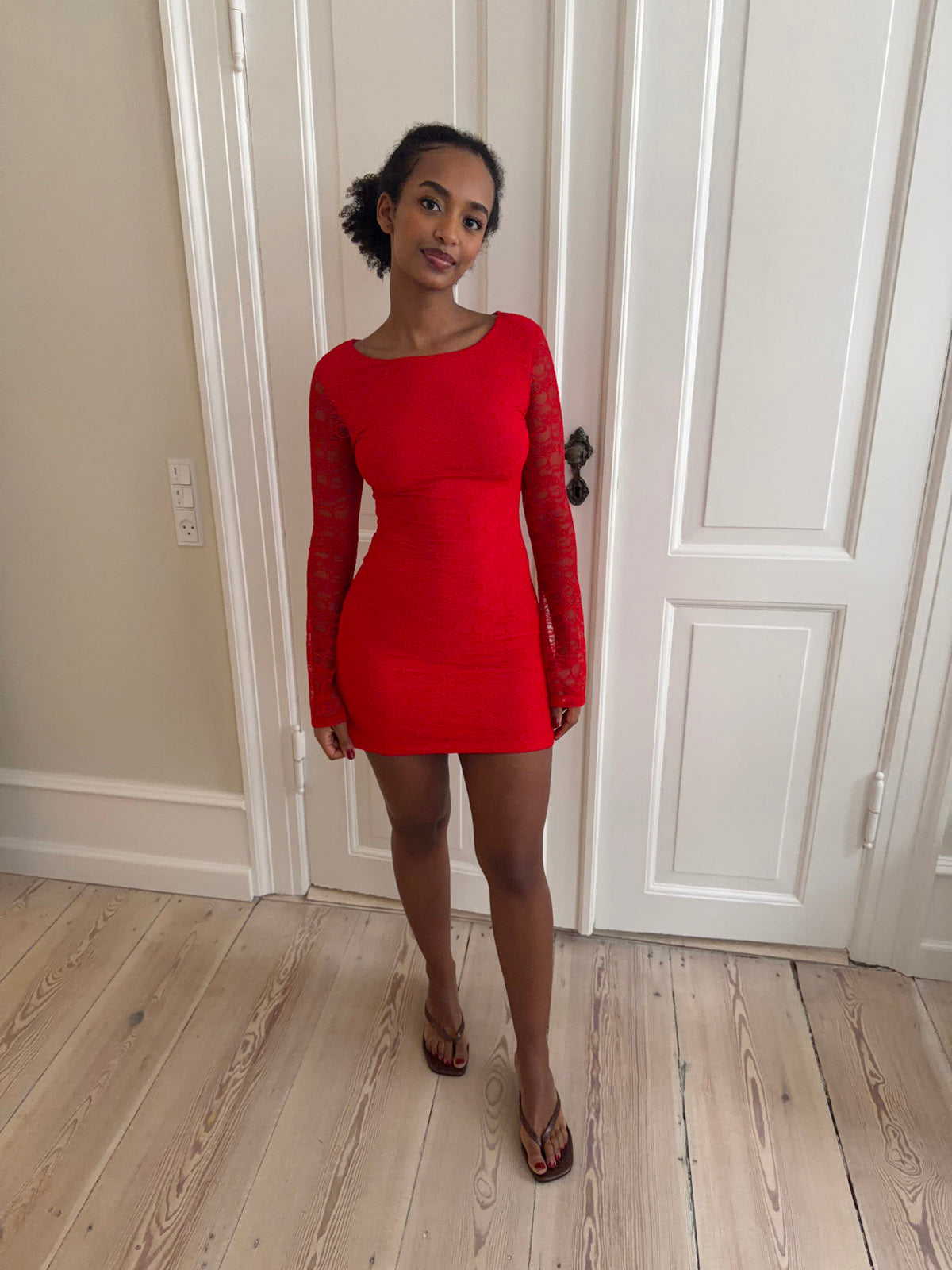Elegant red lace dress crafted from a light and delicate lace fabric with a floral pattern. The dress features long, sheer lace sleeves that provide a feminine and sophisticated look. The body of the dress is gently fitted and includes a soft lining for added comfort, while the sleeves remain unlined for a beautiful, transparent effect.