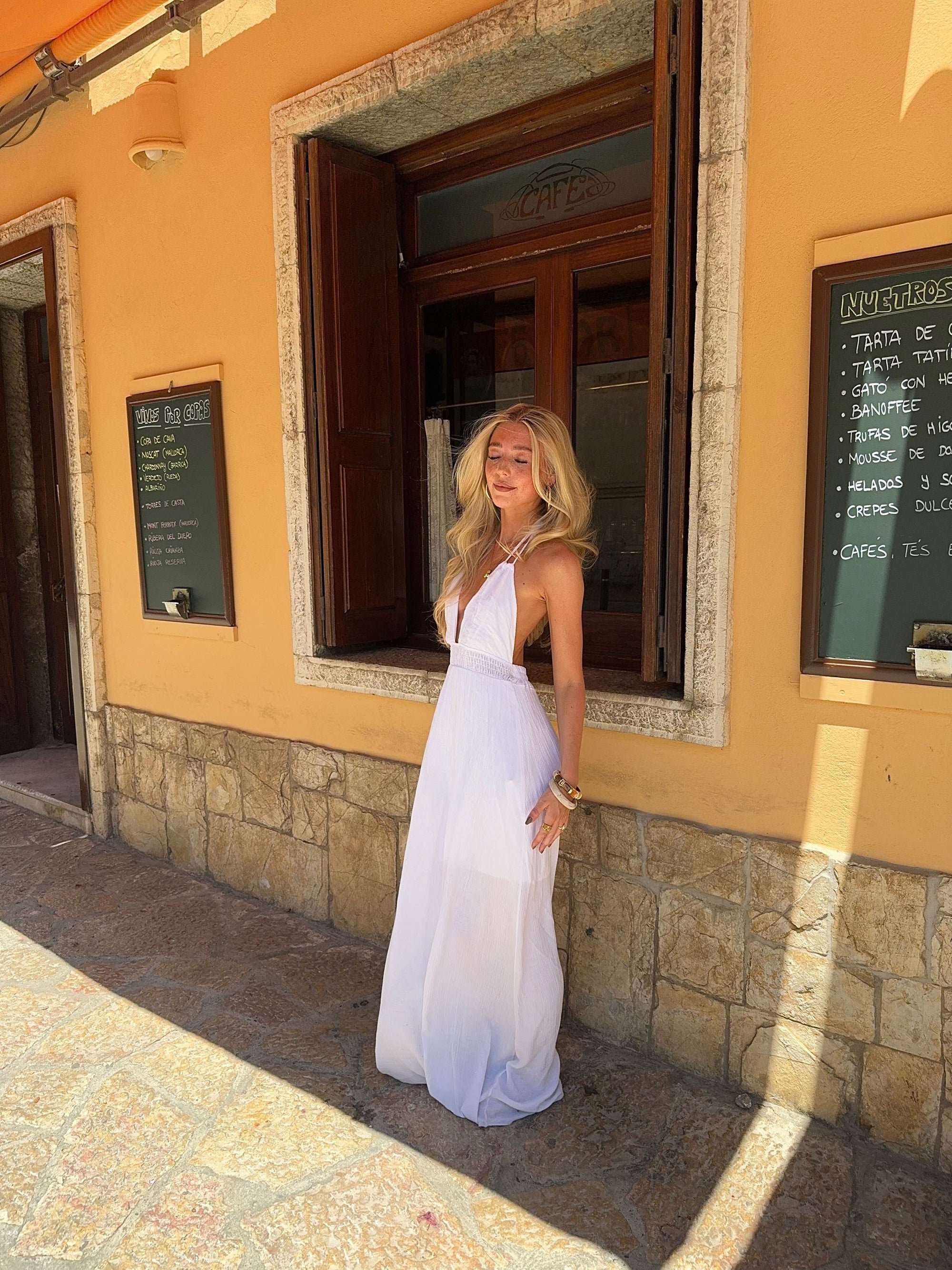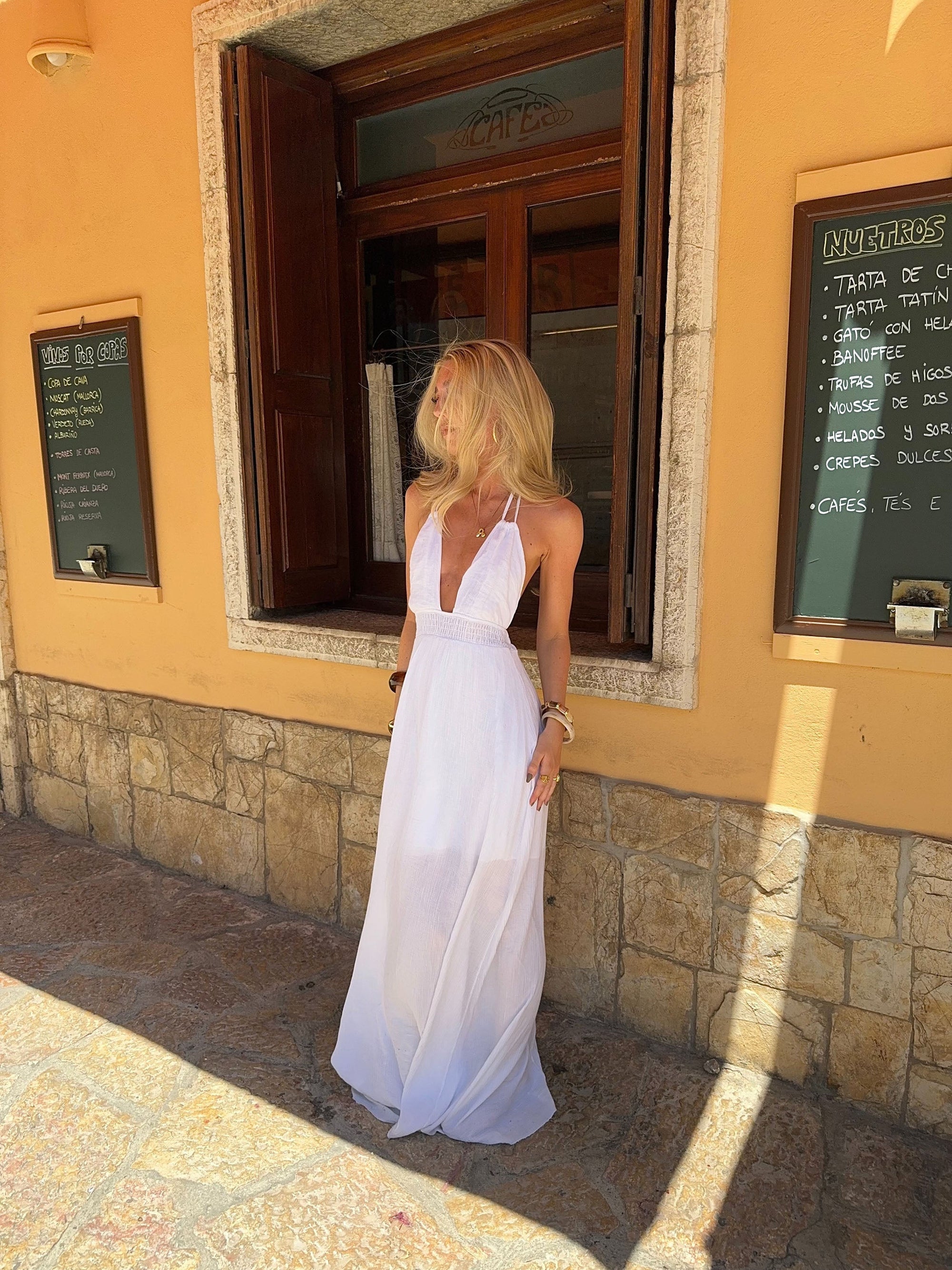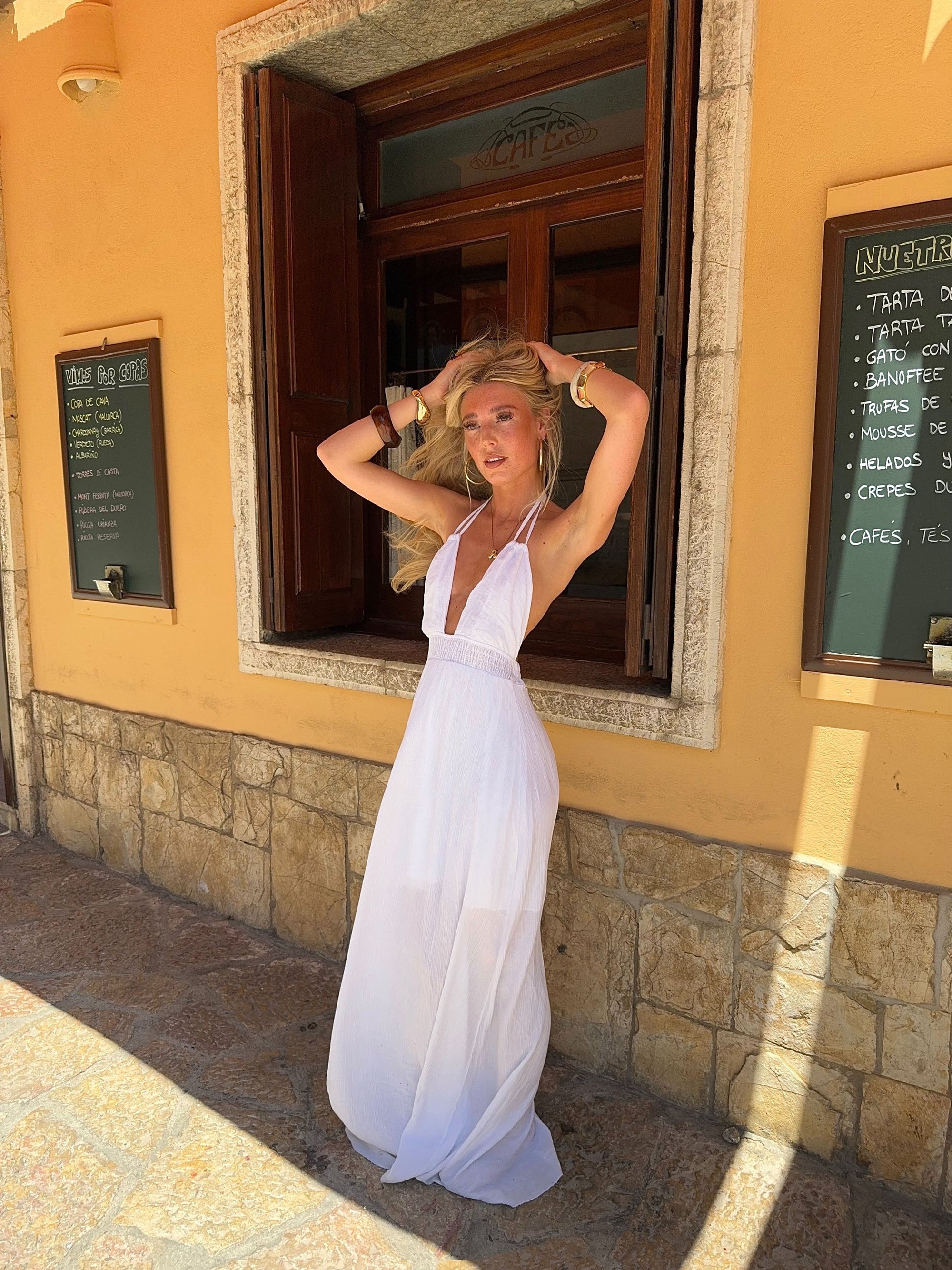This airy maxi dress in soft white cotton is designed with comfort and elegance in mind. The lightly crinkled fabric gives it a relaxed, organic look, while the high gathered neckline and delicate strap details at the back add a feminine and modern edge. The waist is gently defined with elastic to enhance the silhouette in a natural way.
