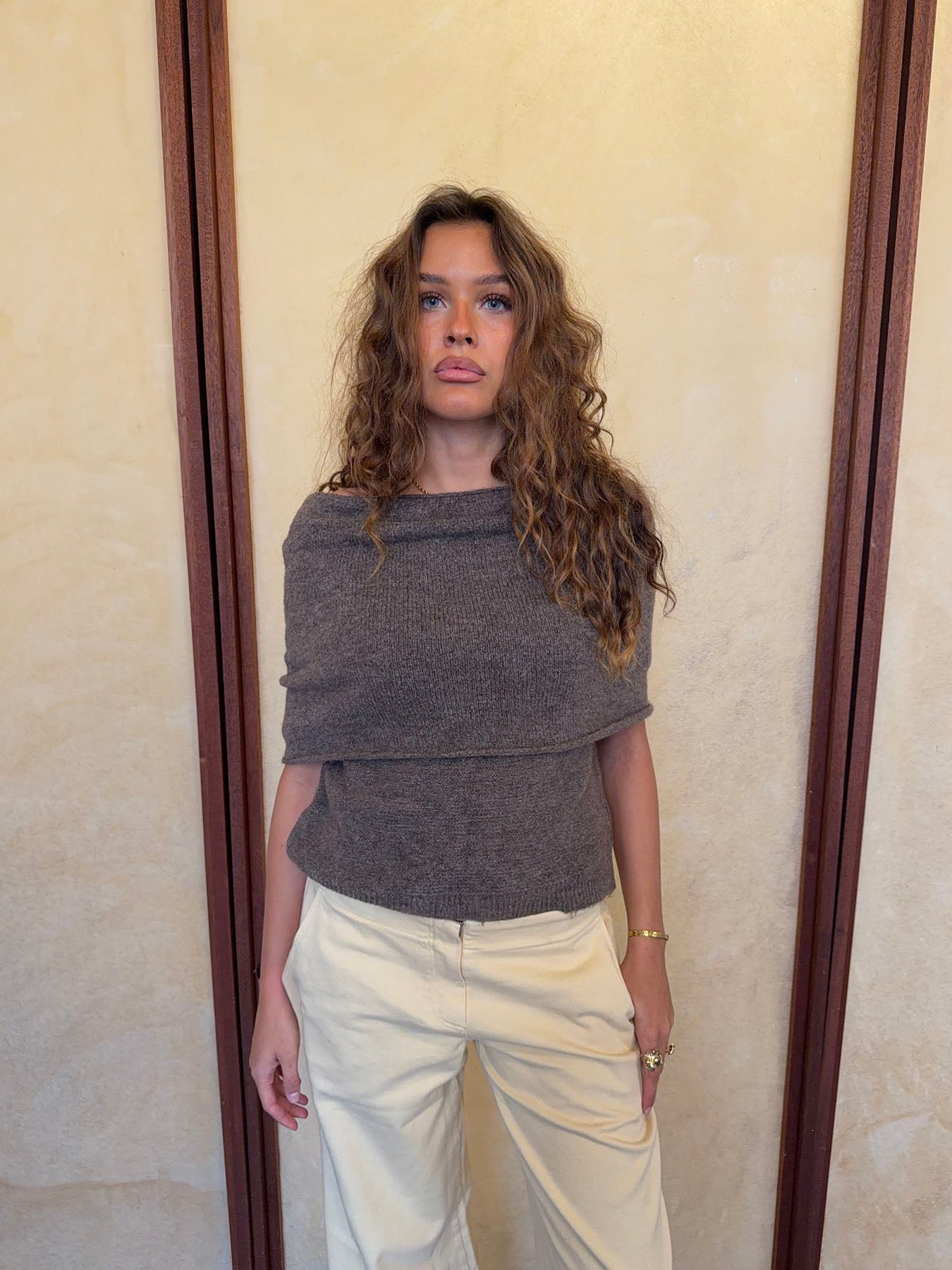 The design features a high neck and loose short sleeves, giving it a relaxed yet sophisticated look. The neutral taupe color makes it easy to style with everything from shirts and dresses to turtlenecks.
