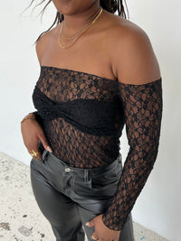White lace blouse in off-shoulder. The top has an extra layer of lace on the chest, so it´s less see-through.