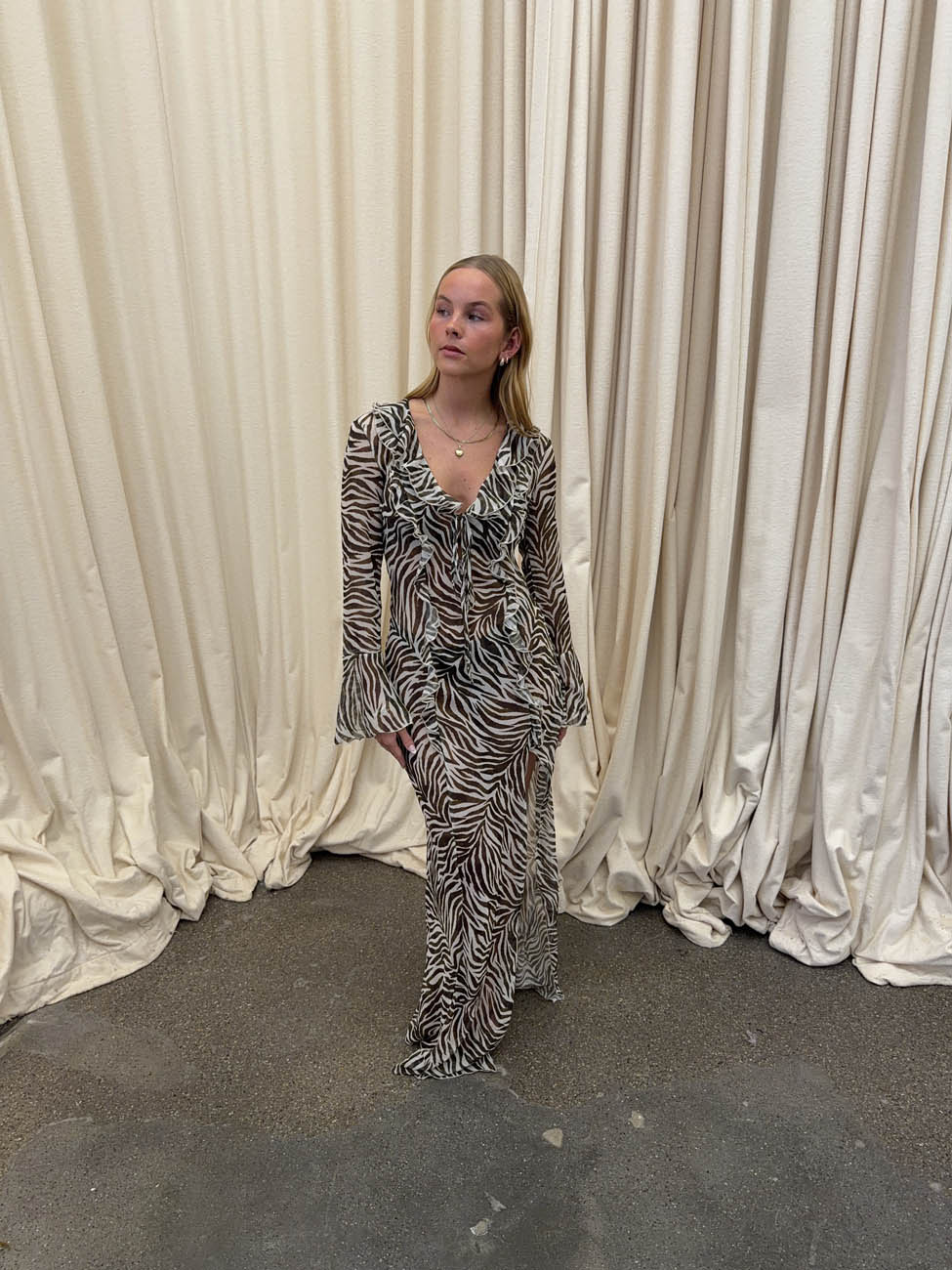 This striking zebra-print maxi dress combines a bold expression with elegant, feminine details. The dress is made from a lightweight, stretchy material that hugs the body and creates a beautiful long silhouette. The long, slightly flared sleeves add a dramatic and sophisticated touch, while the deep V-neckline makes the dress both modern and flattering.
