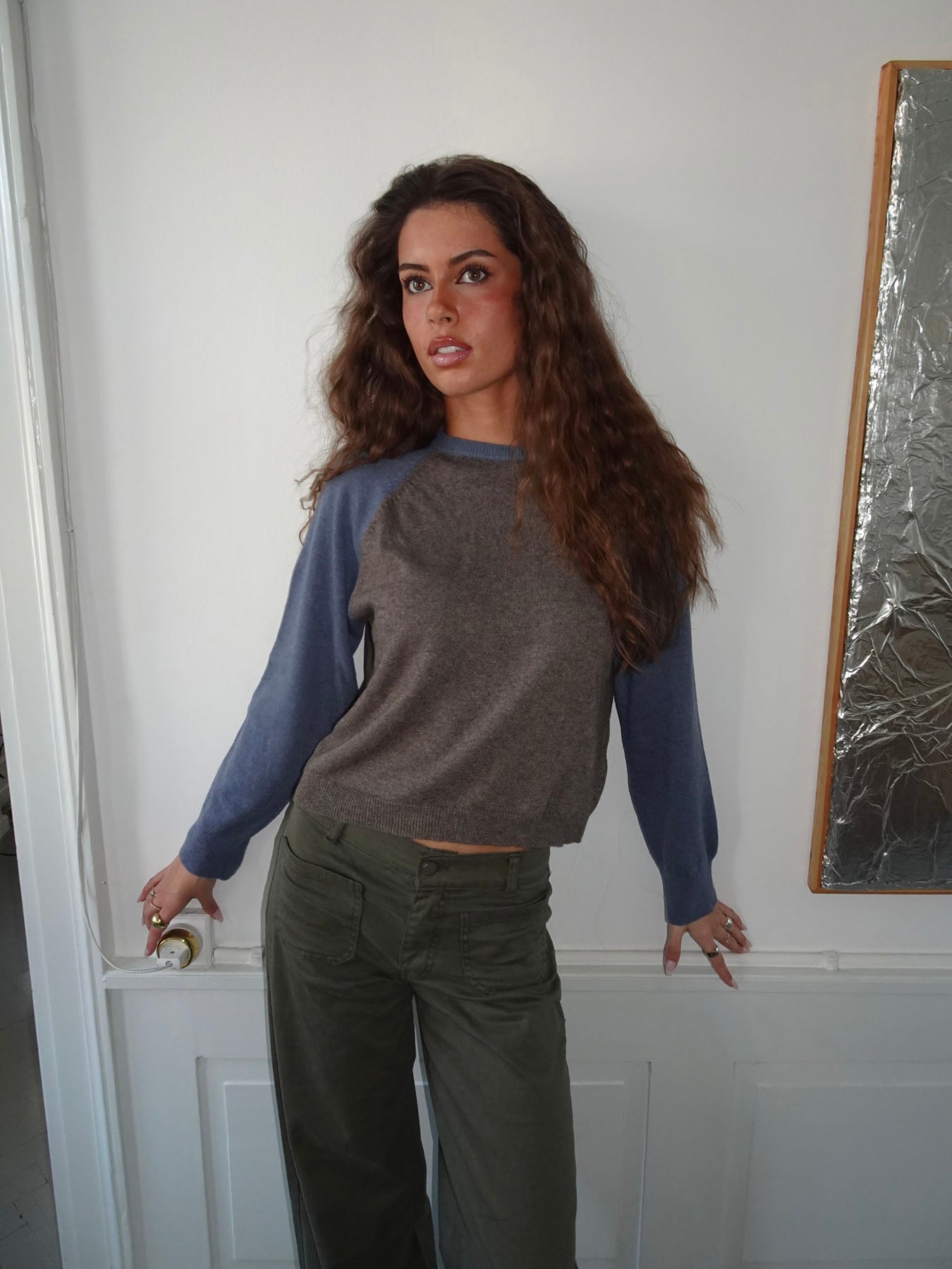 This clean and stylish knit sweater combines two harmonious colors in a modern, sporty design. The body features a warm, melange brown tone, while the sleeves come in a beautiful deep blue, giving the sweater a unique and eye-catching look.
