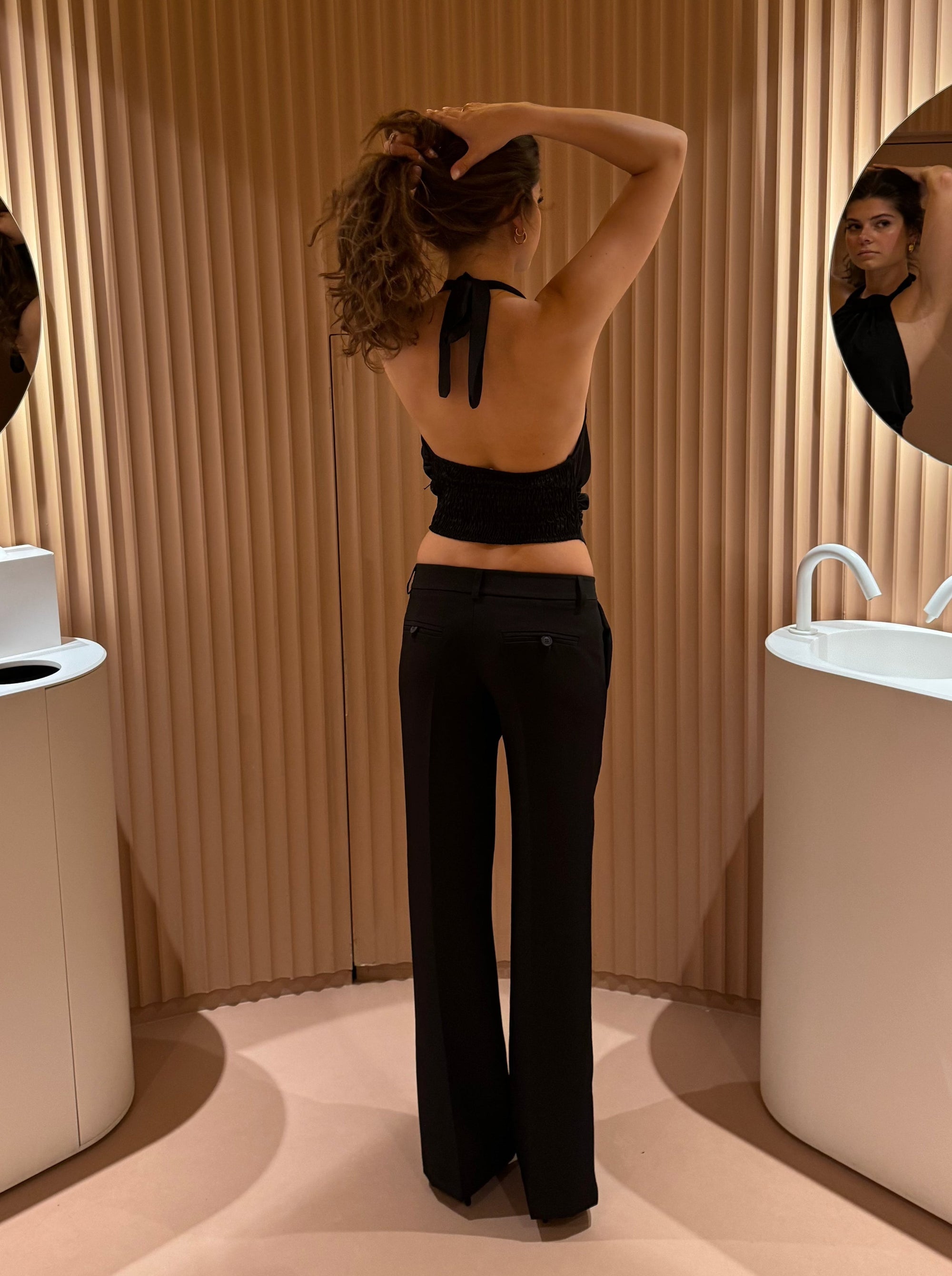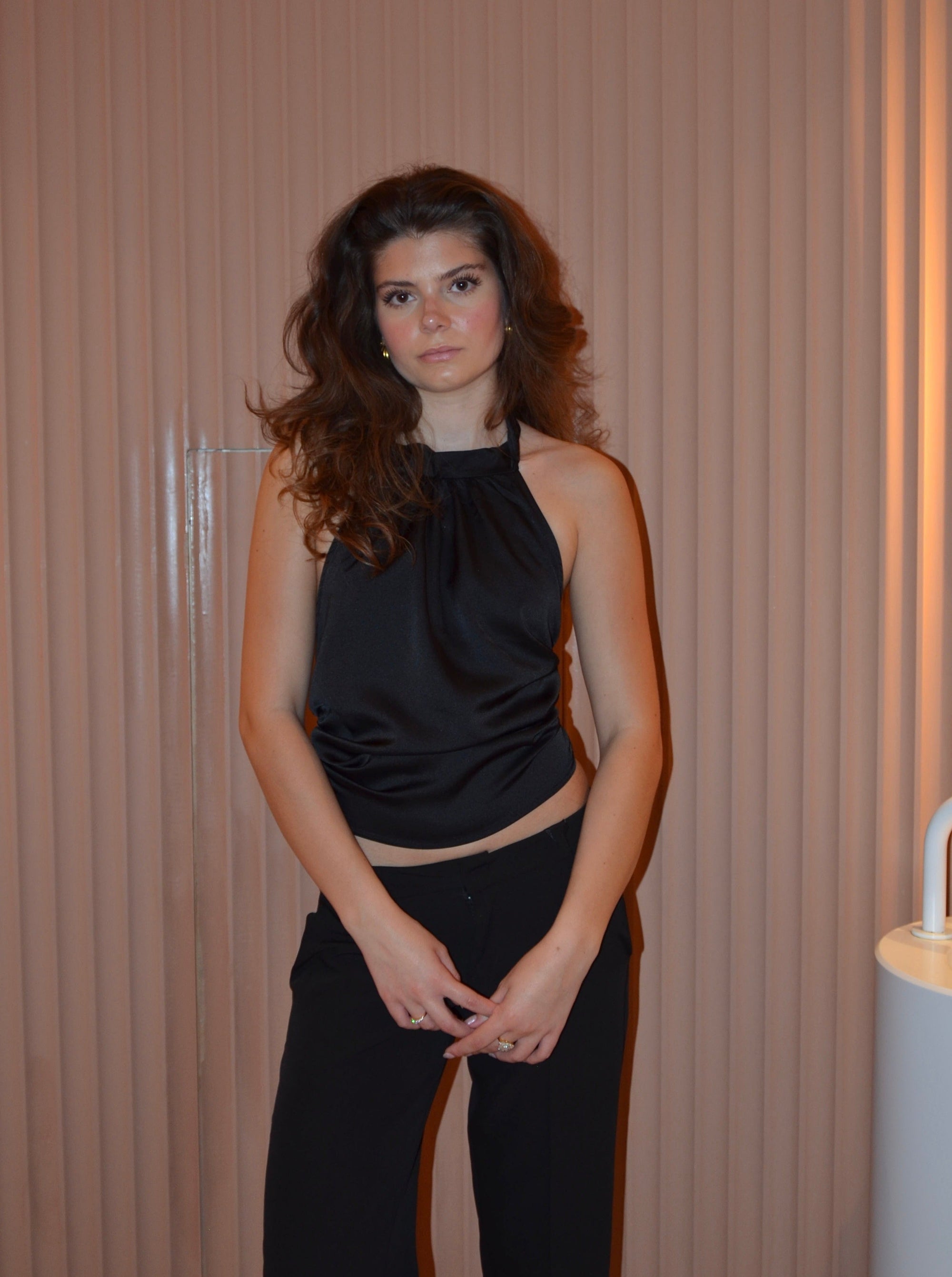 This top is absolutely perfect for festive events. This top is cropped and has a halterneck design that ties at the neck. It has a smock at the back which makes it elastic and is made of a satin material.