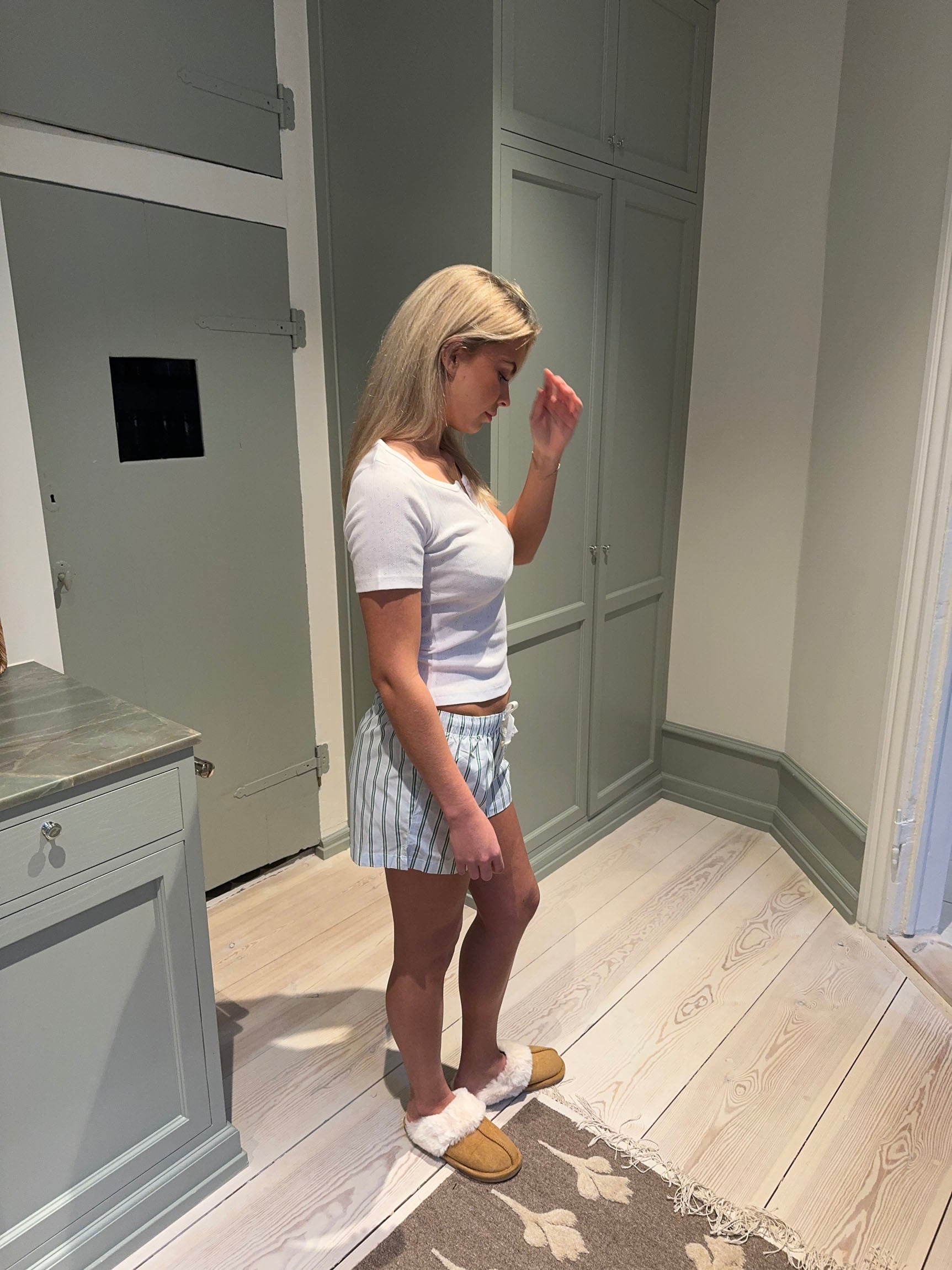 These pyjamas shorts are both comfortable and stylish, perfect for relaxing at home. They are light blue with green and white stripes, giving them a fresh and modern look. The material is soft and comfortable, making them ideal for lounging at home. The shorts feature an elastic waistband with an adjustable drawstring for a perfect fit, along with decorative buttons at the front. They are easy to style with a cute top or a basic t-shirt, making them a perfect choice for cozy moments at home.